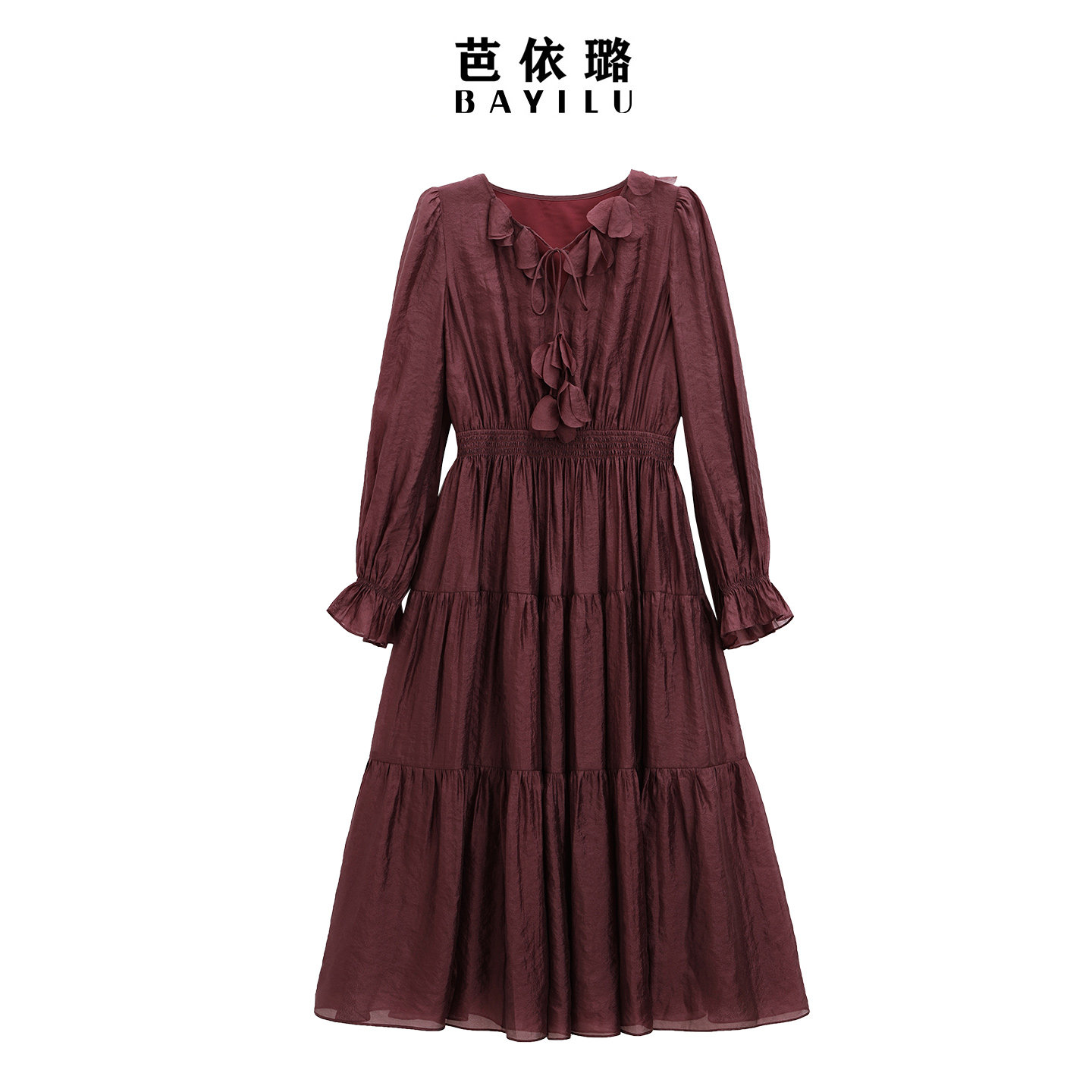 芭依璐2026春装新品长袖韩版连衣裙V领飘带收腰安可拉红长裙子女
