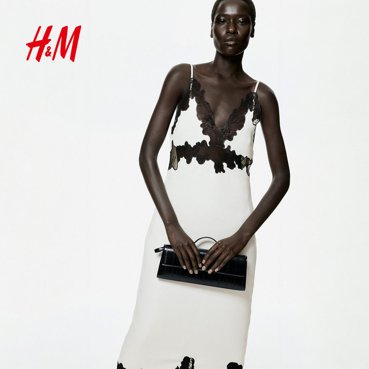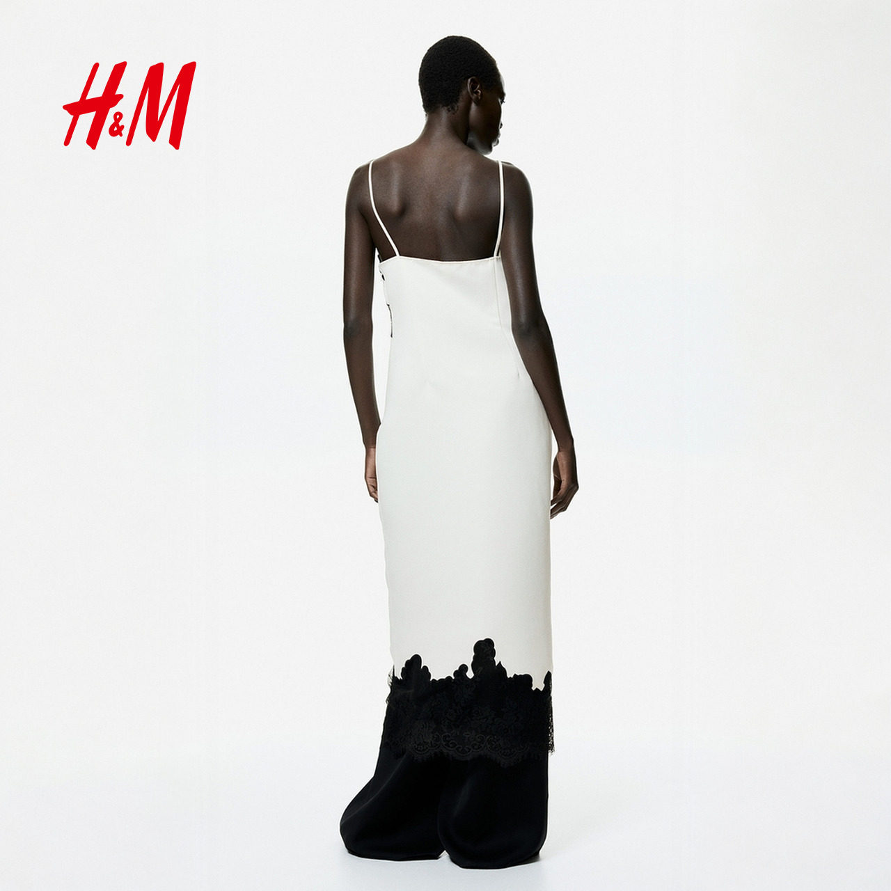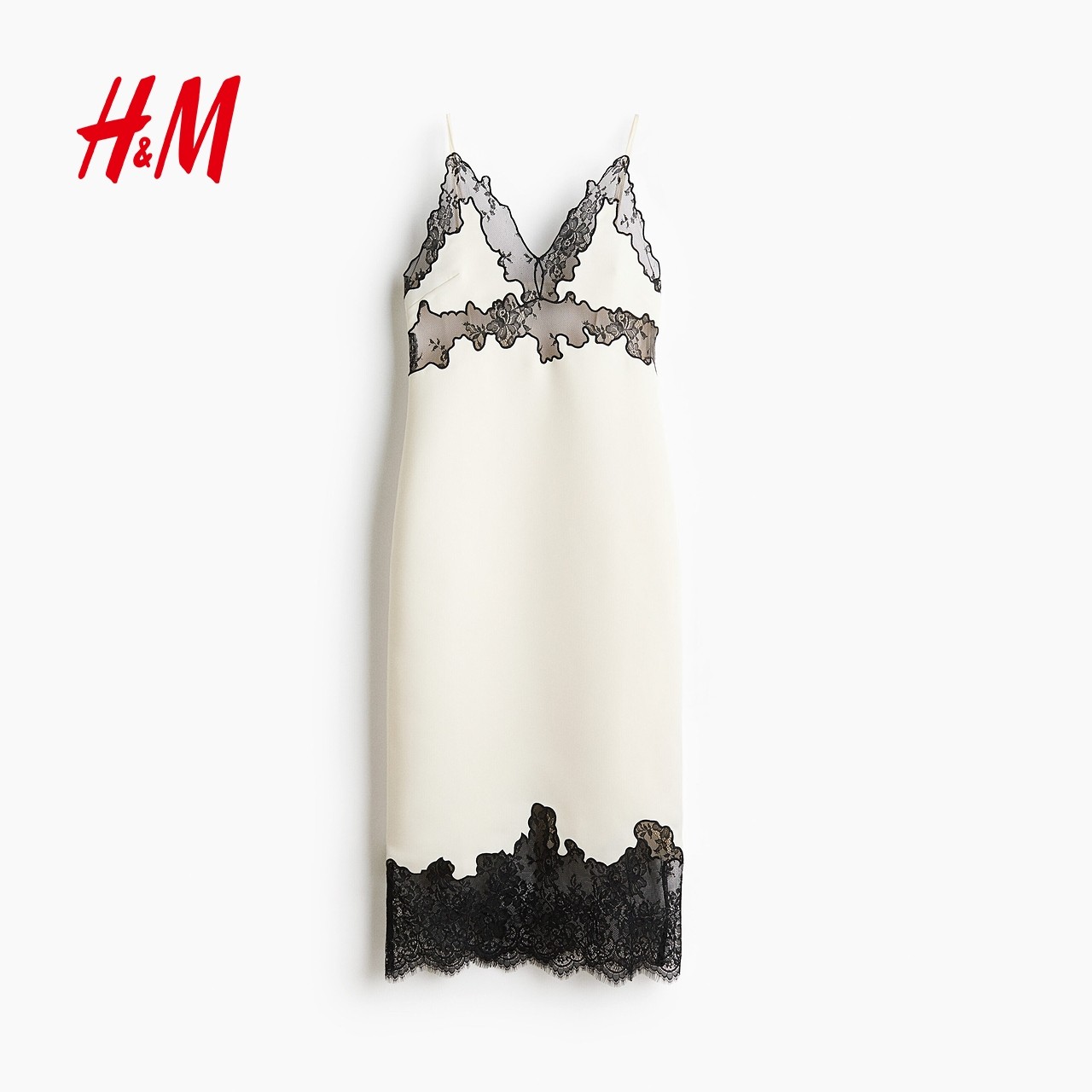 HM女装连衣裙2026春夏新款缎质V领蕾丝边吊带裙连身中长裙1332686