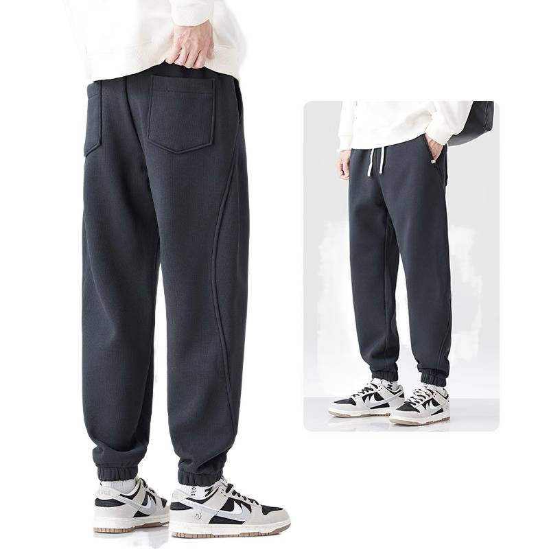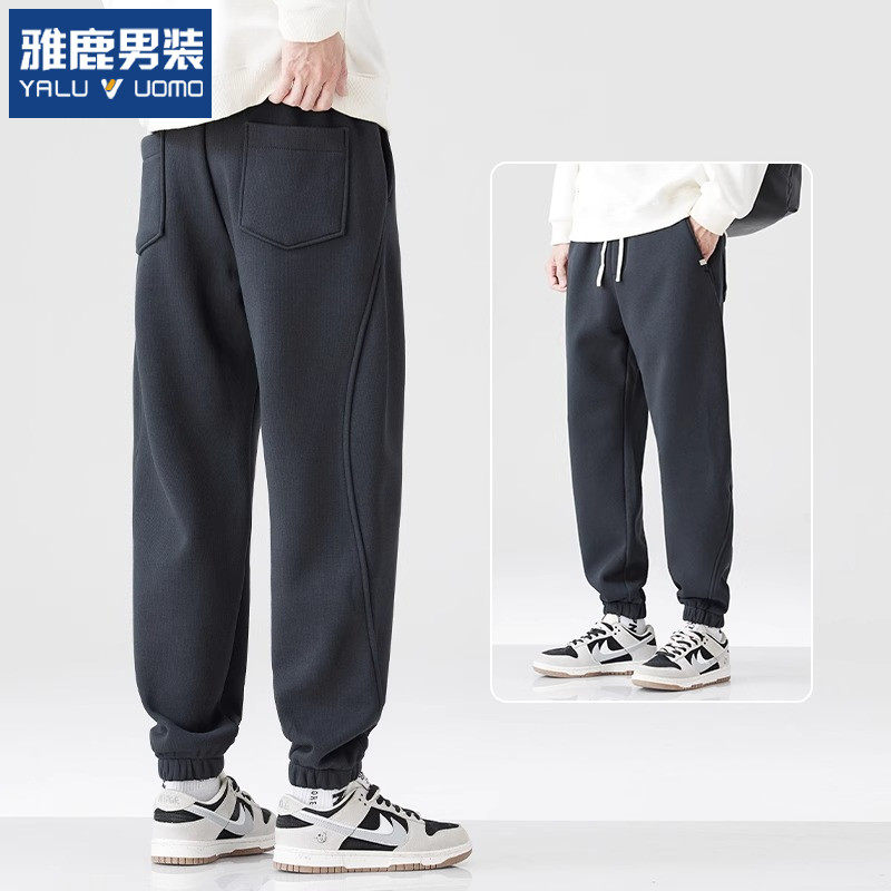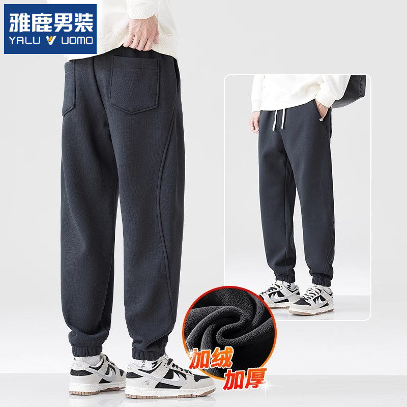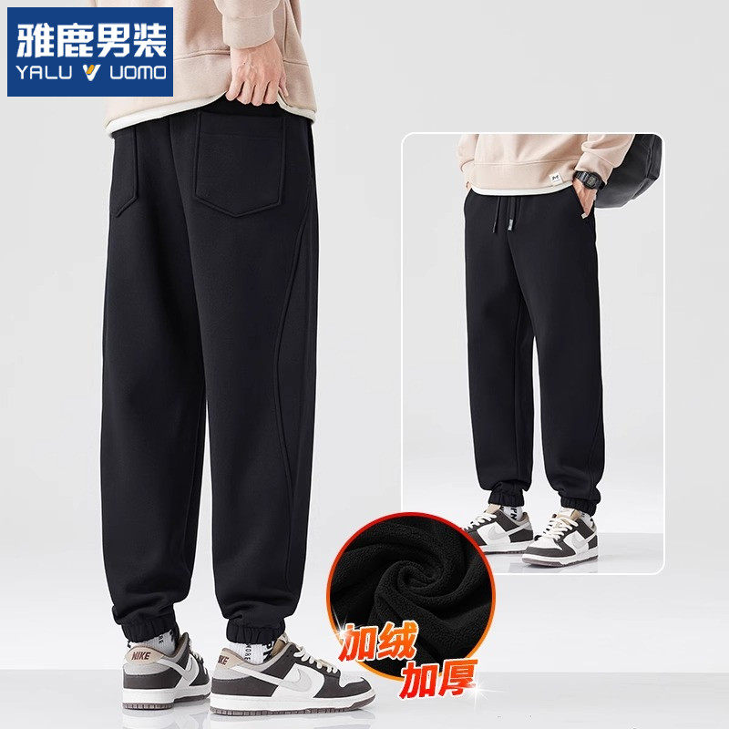 雅鹿男装冬季加绒裤子男宽松束脚潮牌百搭青少年重磅针织休闲卫裤