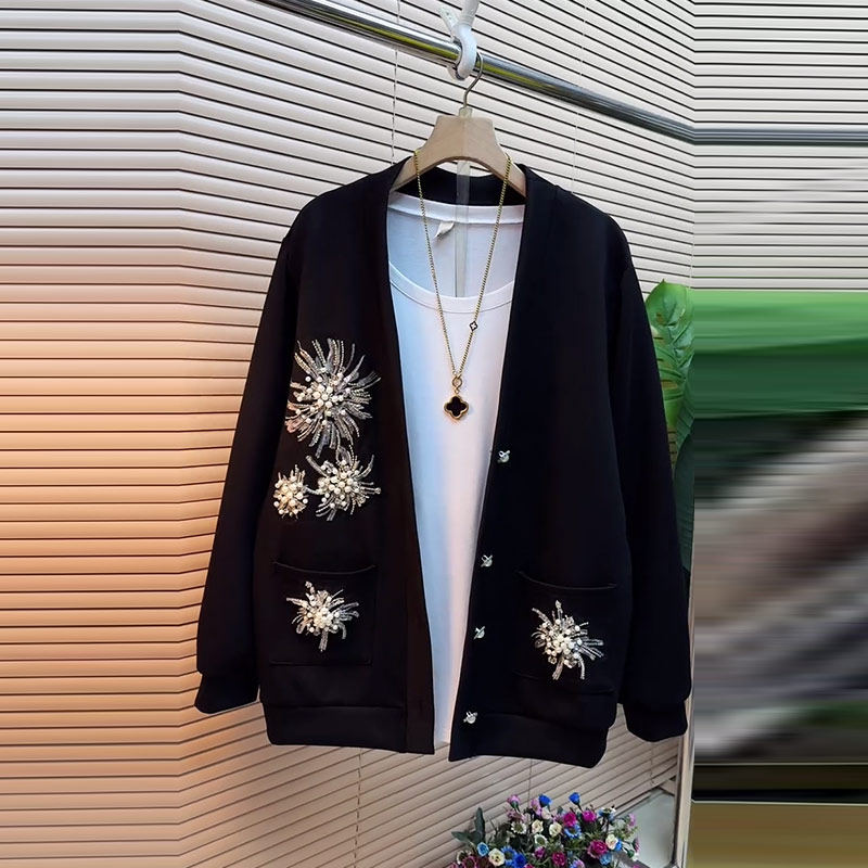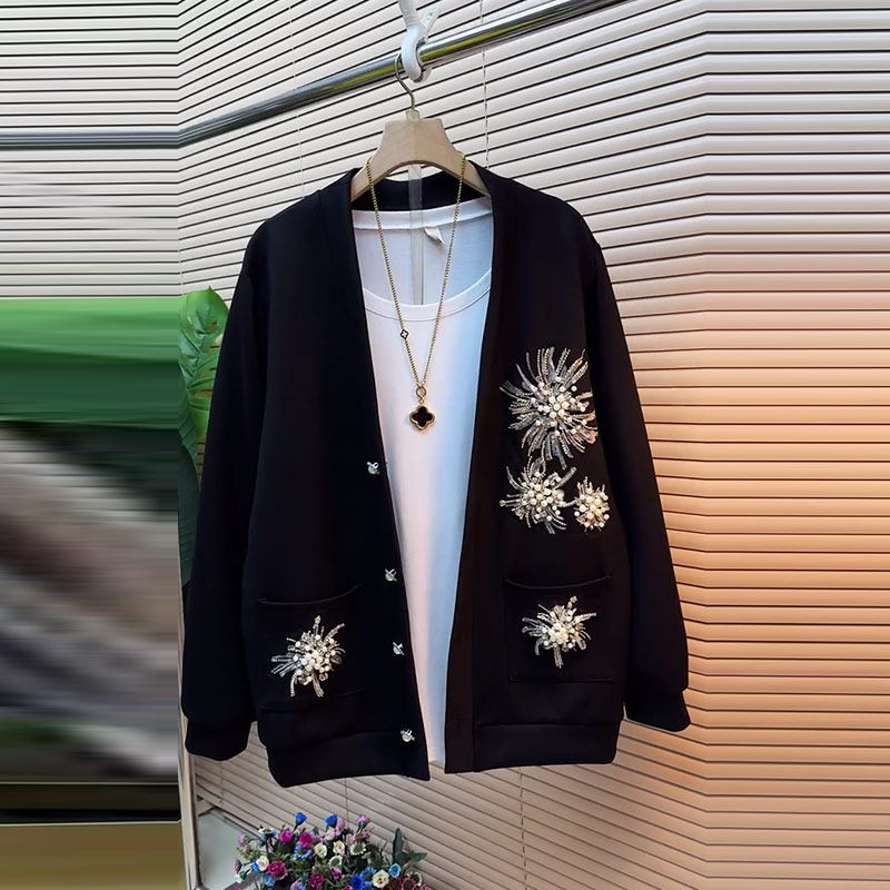 胖妹妹加肥钉珠花长袖外套韩版大码女装黑色显瘦2026早春新款上衣