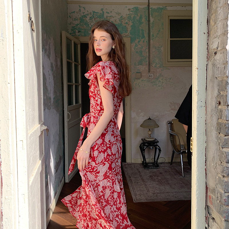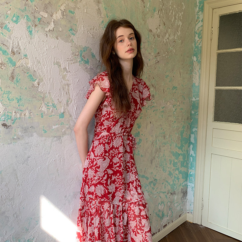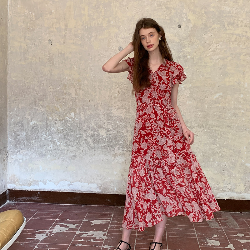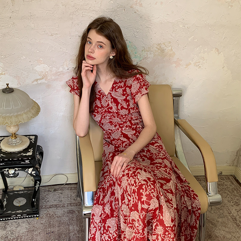 ZHUYIYI 茶歇系碎花连衣裙女夏长裙V领收腰高级感原创设计感长裙
