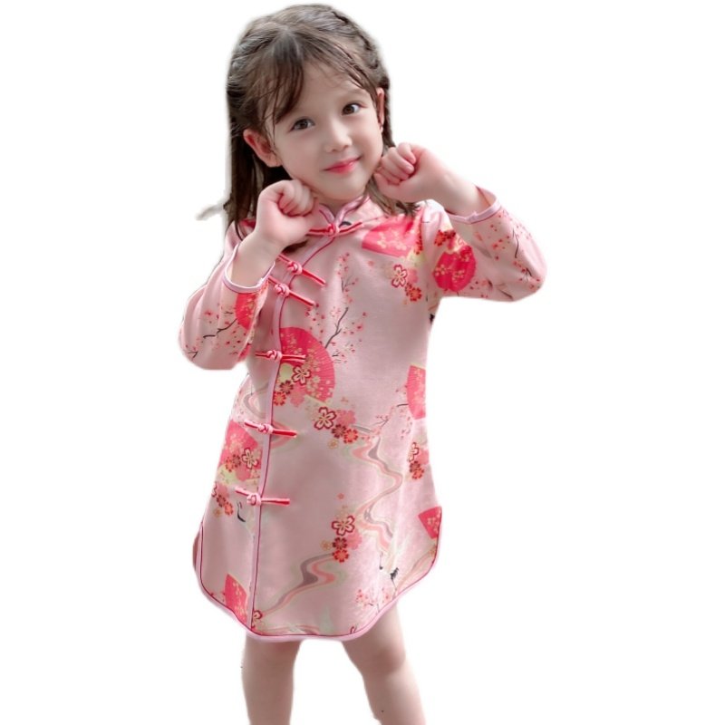 儿童旗袍春季款长袖改良汉服女孩中国风中长款连衣裙女童可爱唐装