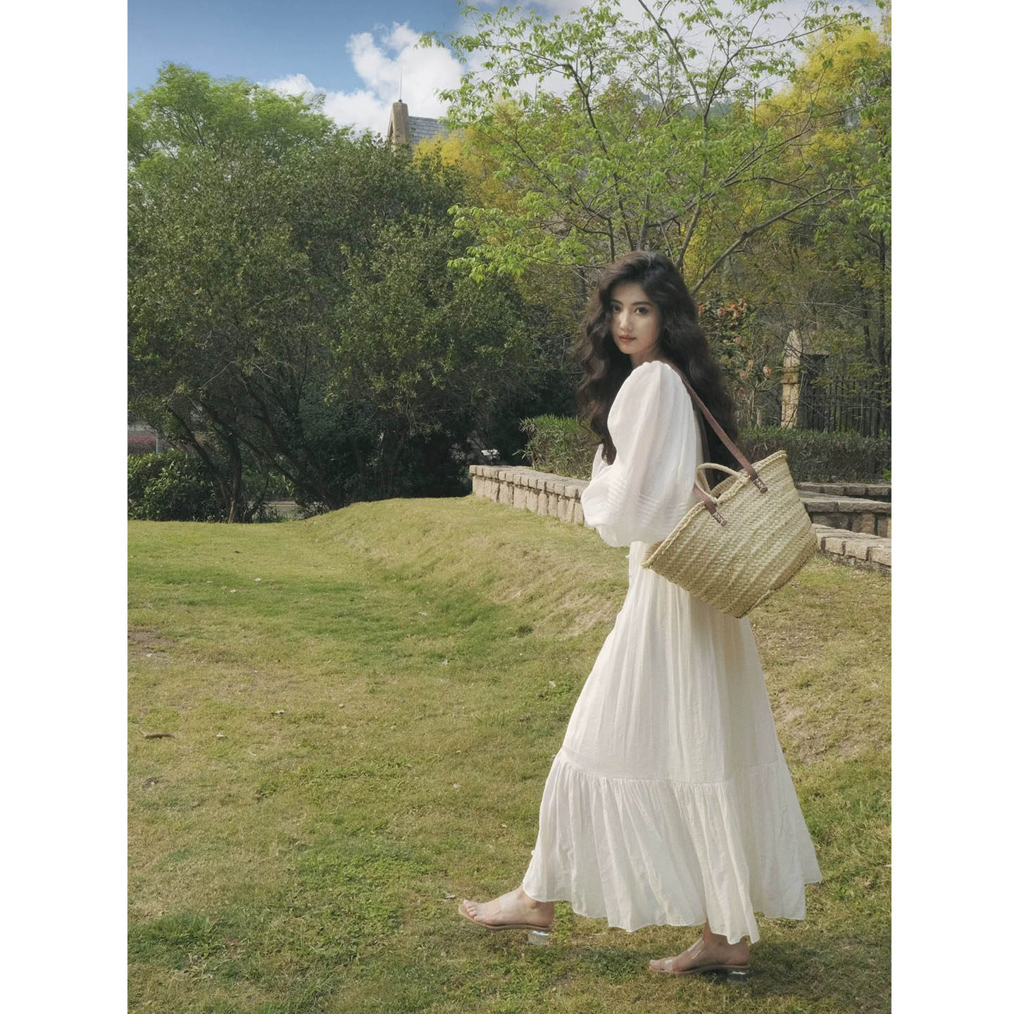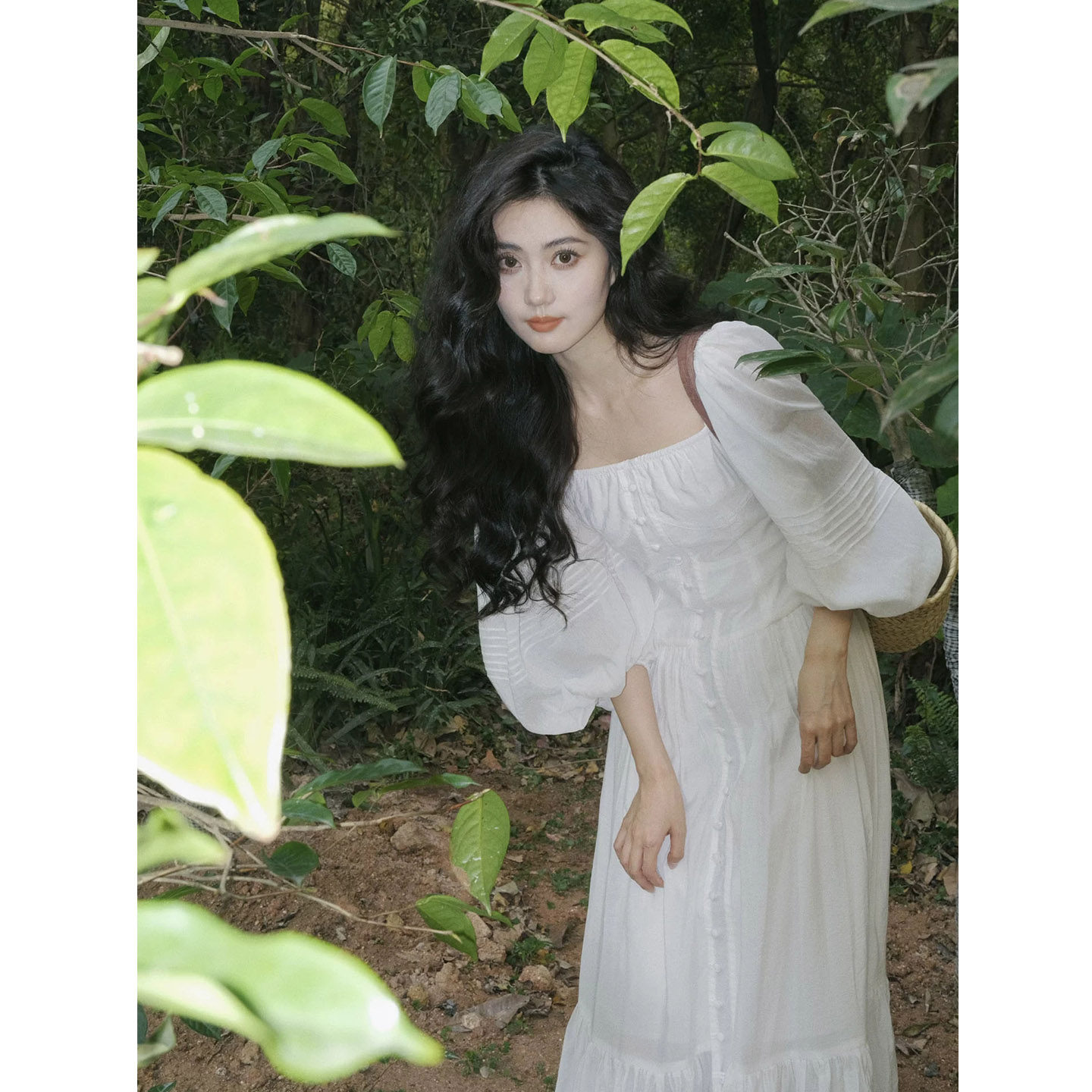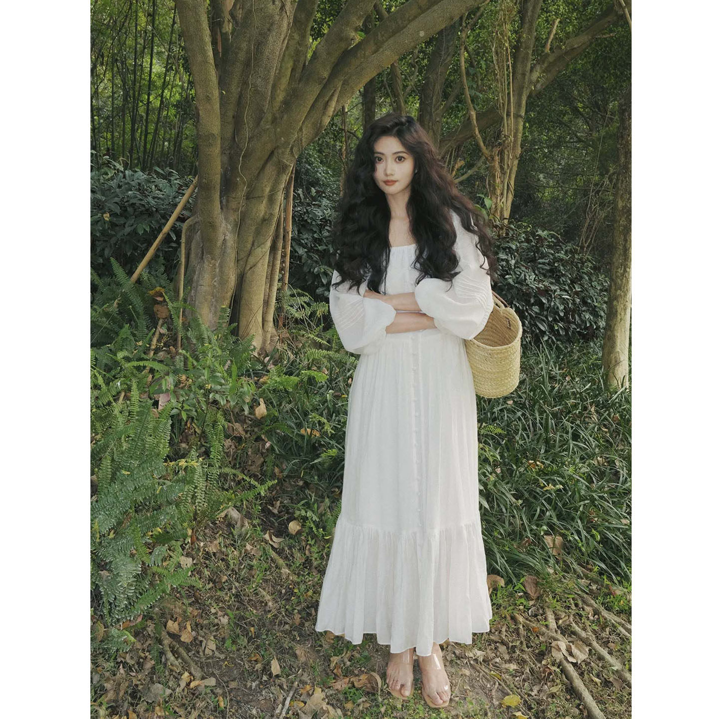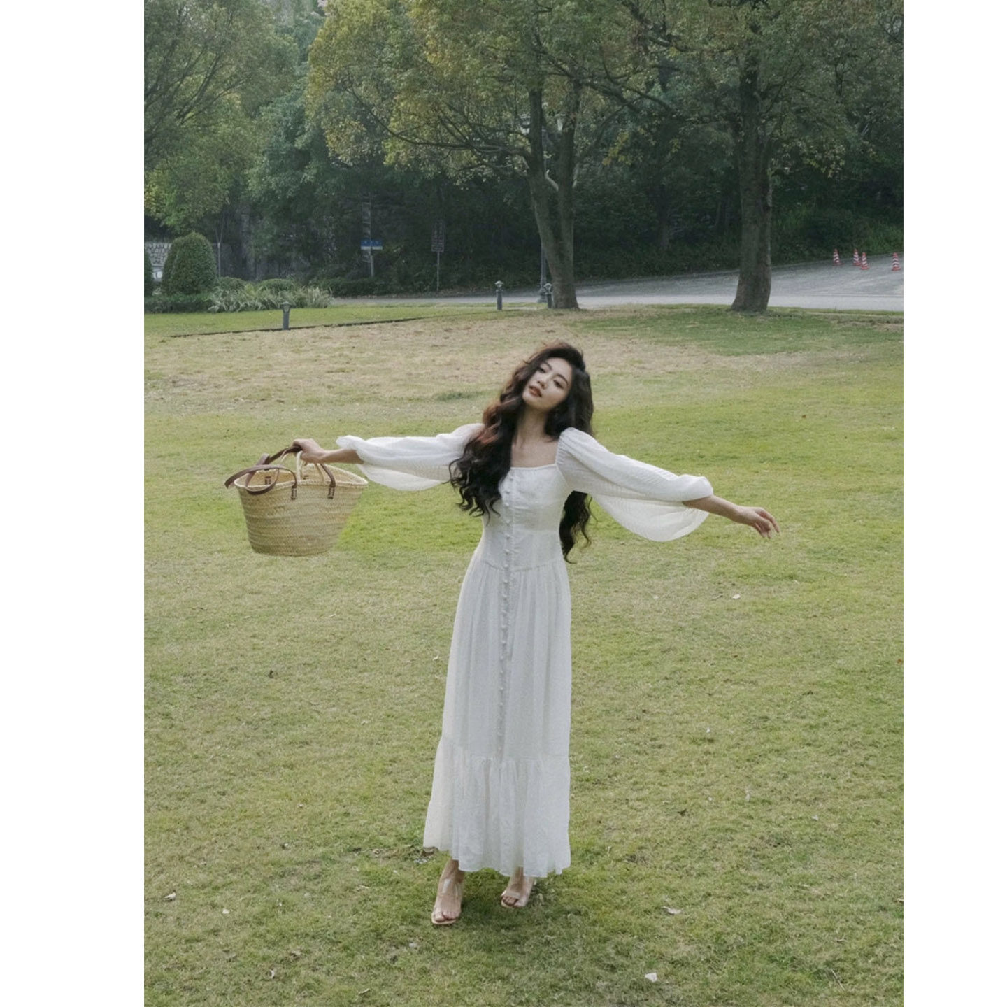 大码法式复古方领白色仙女连衣裙女夏季高级感泡泡袖茶歇雪纺长裙