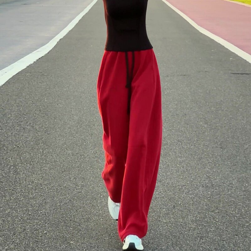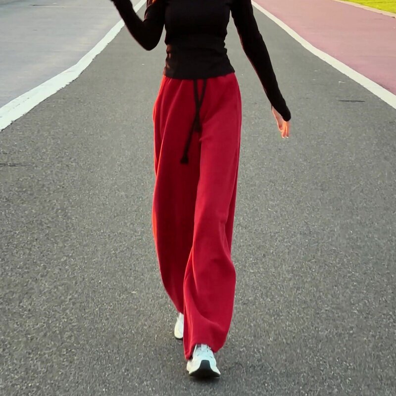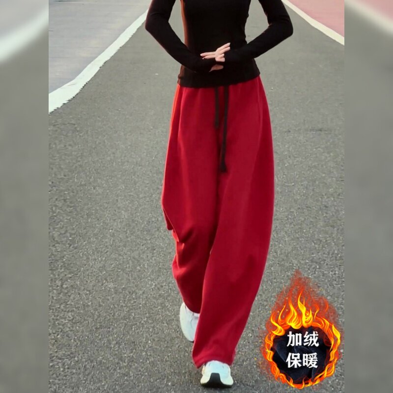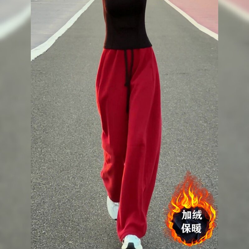 红色加绒裤子女秋冬2026新款今年流行爆款加厚弯刀裤阔腿运动卫裤