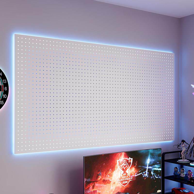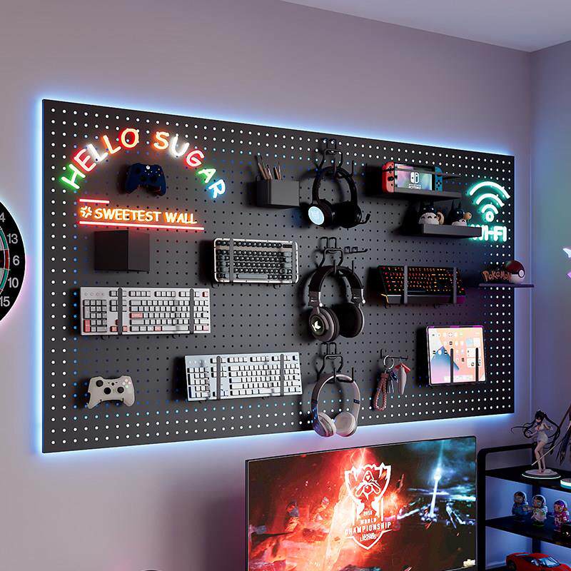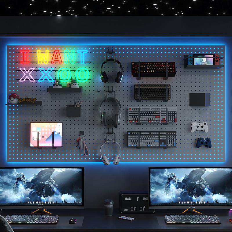 电竞房金属洞洞板置物架黑色墙上电脑桌墙面收纳气氛灯装饰展示架