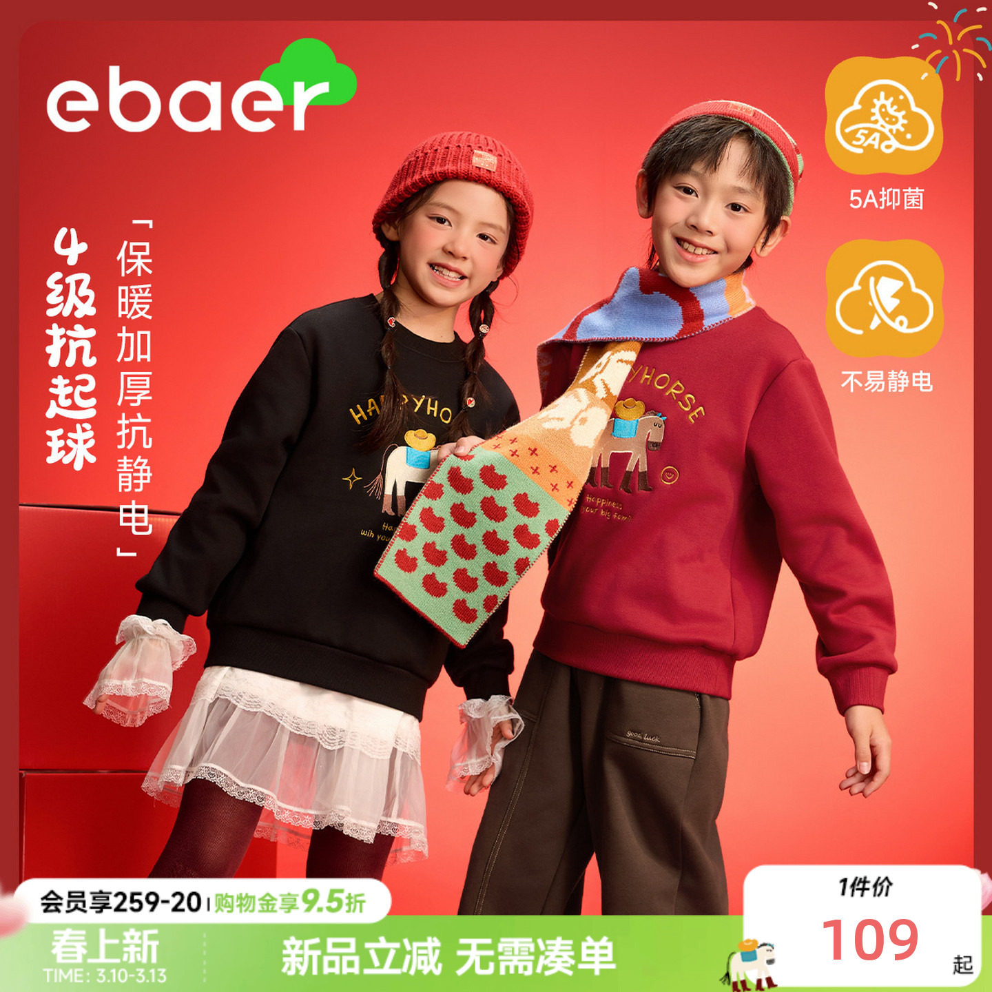 EBAER童装儿童加绒卫衣2026冬季新款男女童马年拜年服保暖红色潮