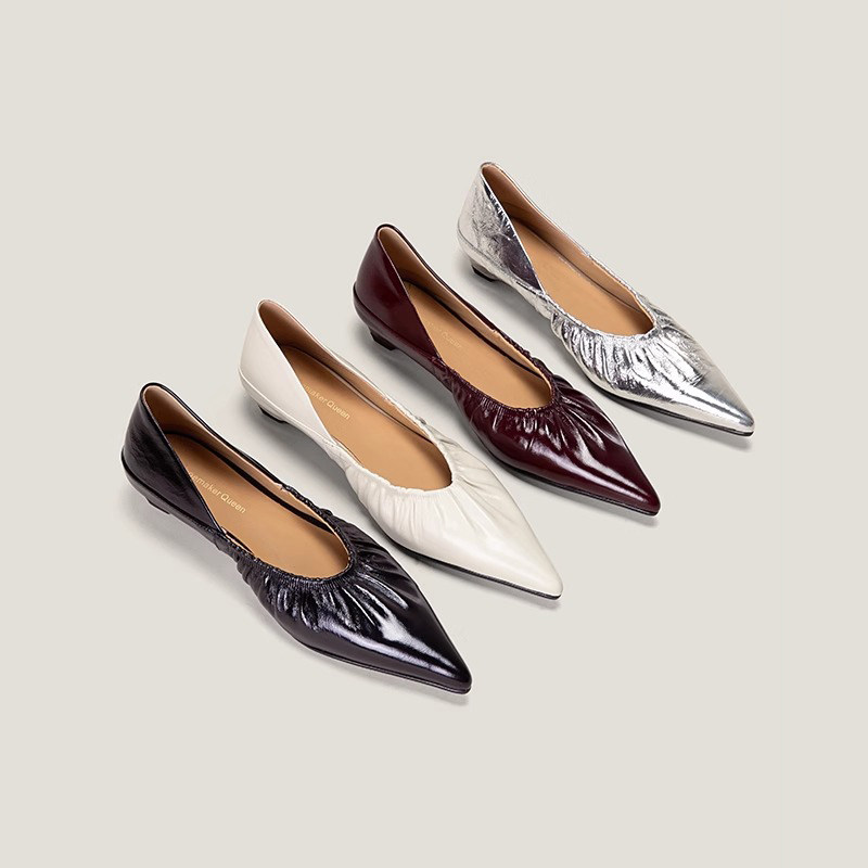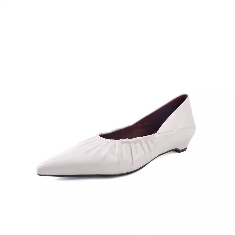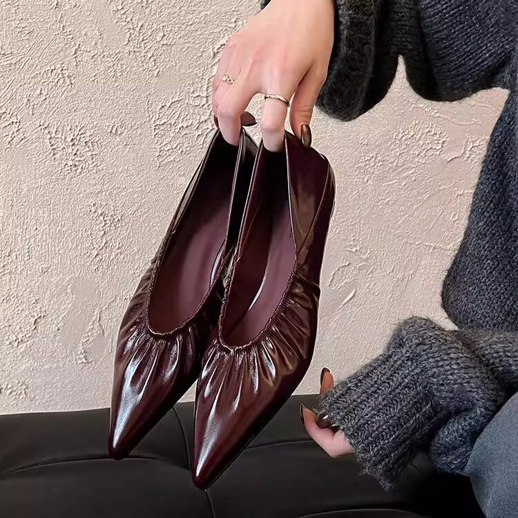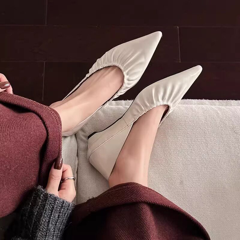 羊皮版法式尖头百搭浅口单鞋2025春夏新款褶皱气质坡跟奶奶鞋女士