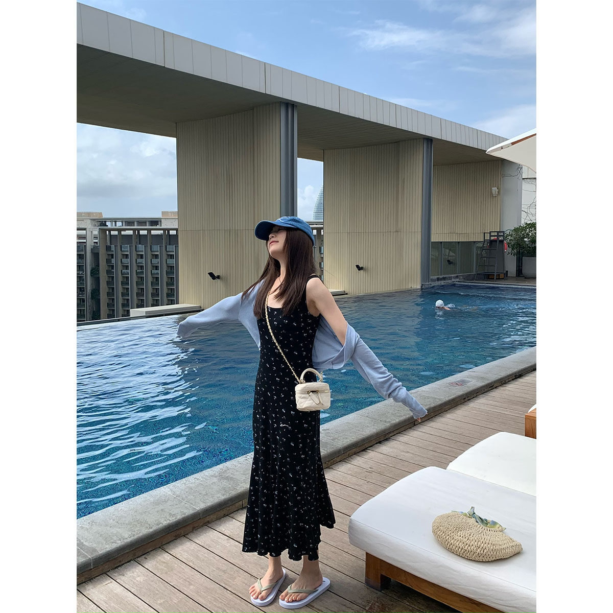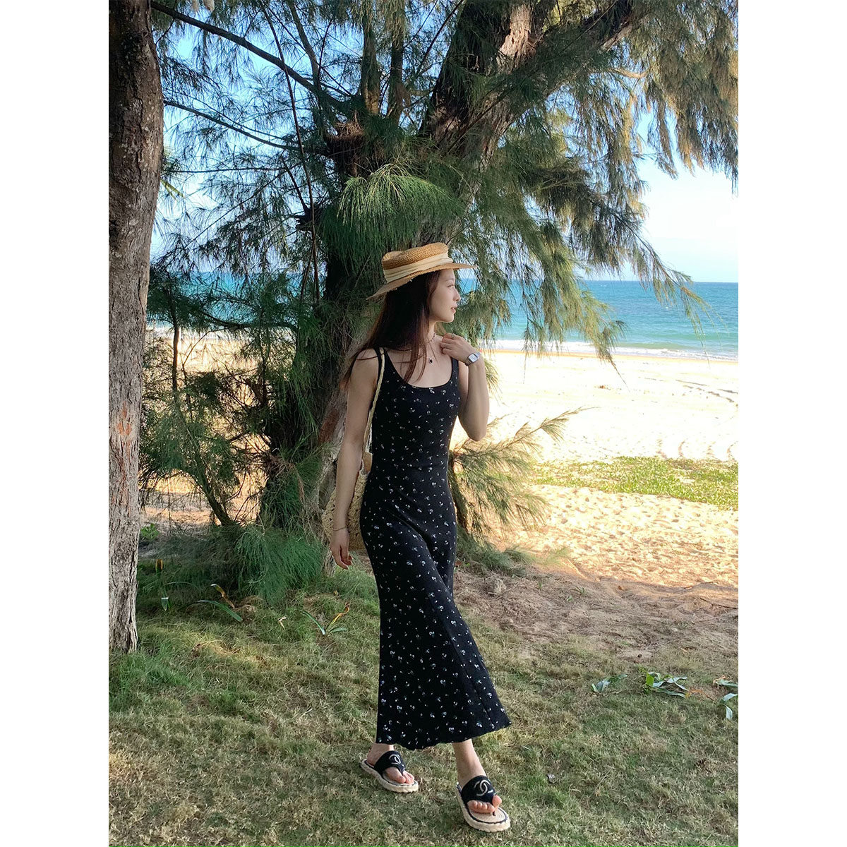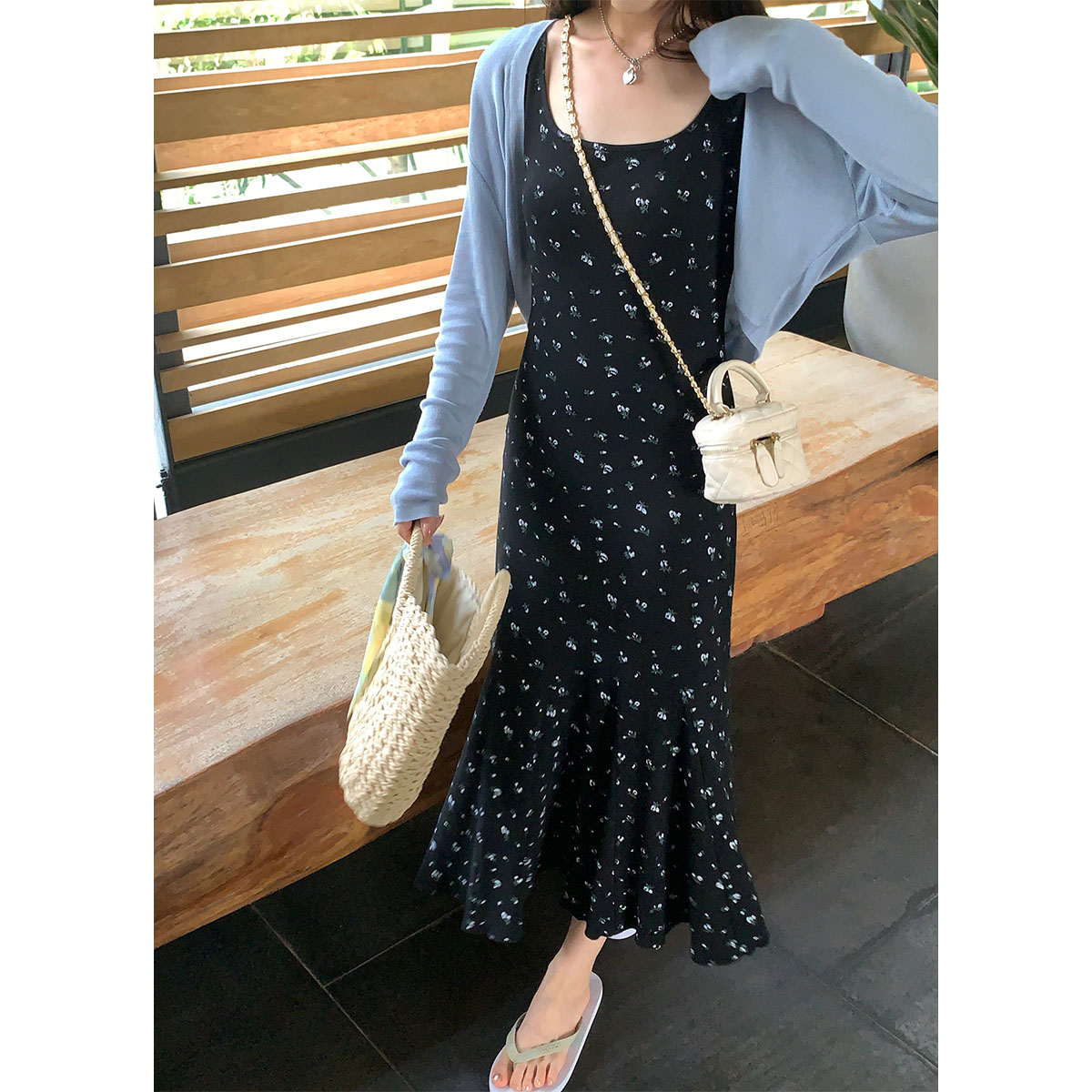 sieyiu法式黑色碎花包臀鱼尾长裙春夏复古内搭无袖收腰吊带连衣裙