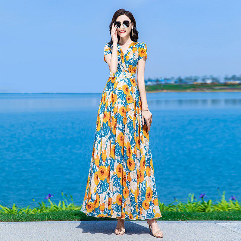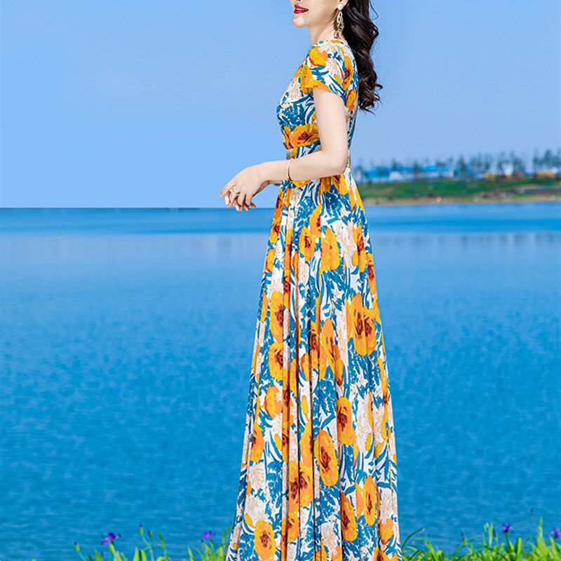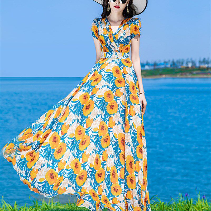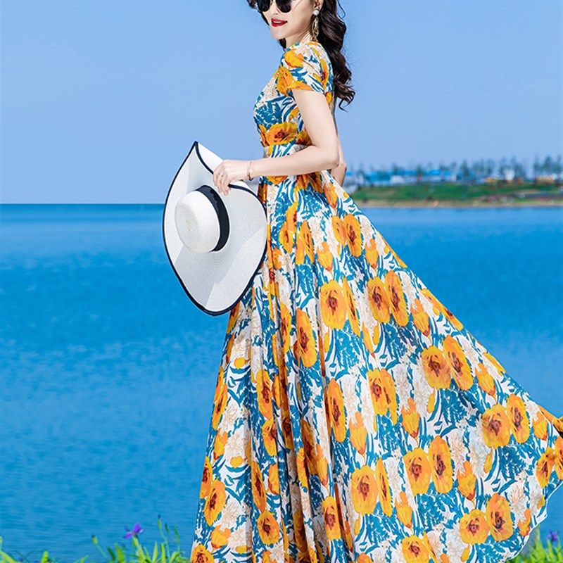 碎花连衣裙女长款到脚踝2024年夏季新款法式显瘦雪纺大摆超长裙子
