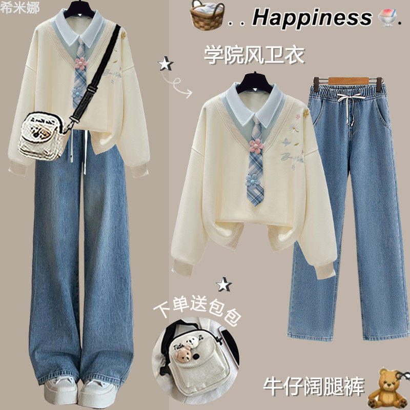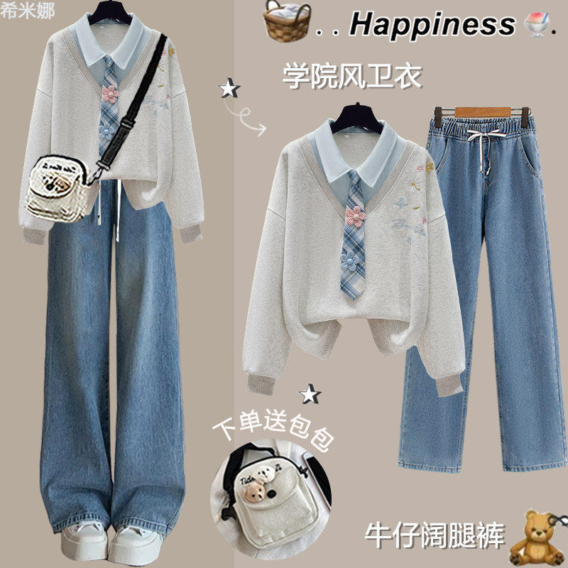 初中生女春装套装学院风少女假两件卫衣时尚洋气青少年休闲运动装