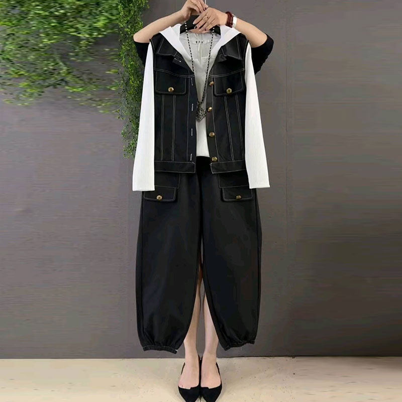 2026春季新款胖mm大码女装欧货时尚减龄明线马甲打底帽衫裤子套装