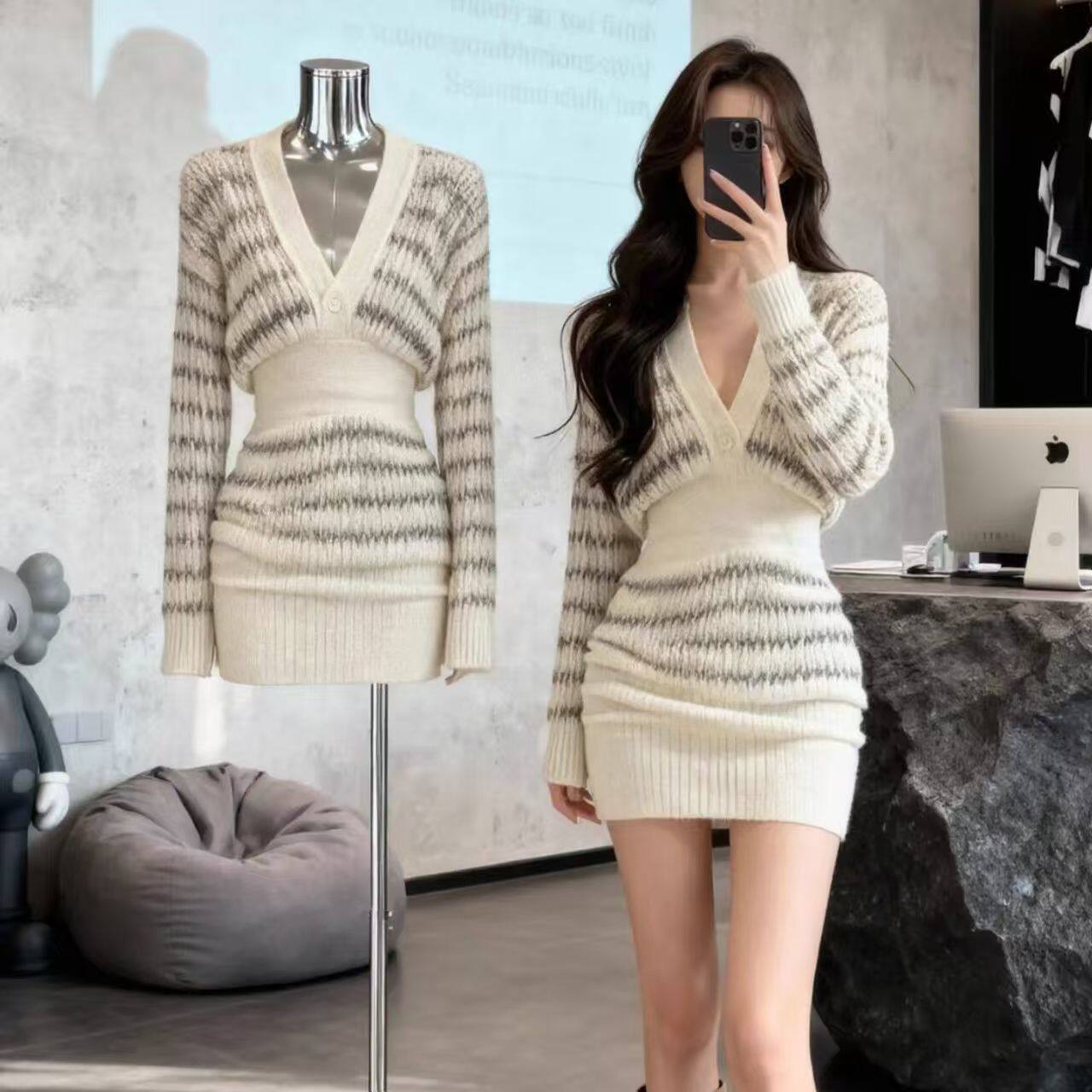 2025秋冬新款时尚潮流针织V领白色收腰小个子短款连衣裙女装裙子