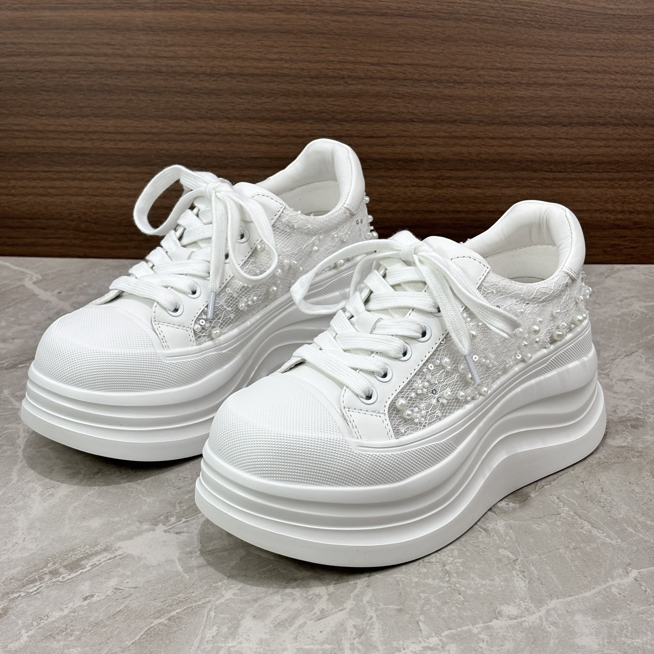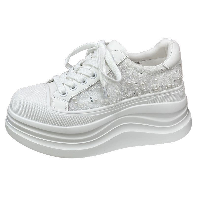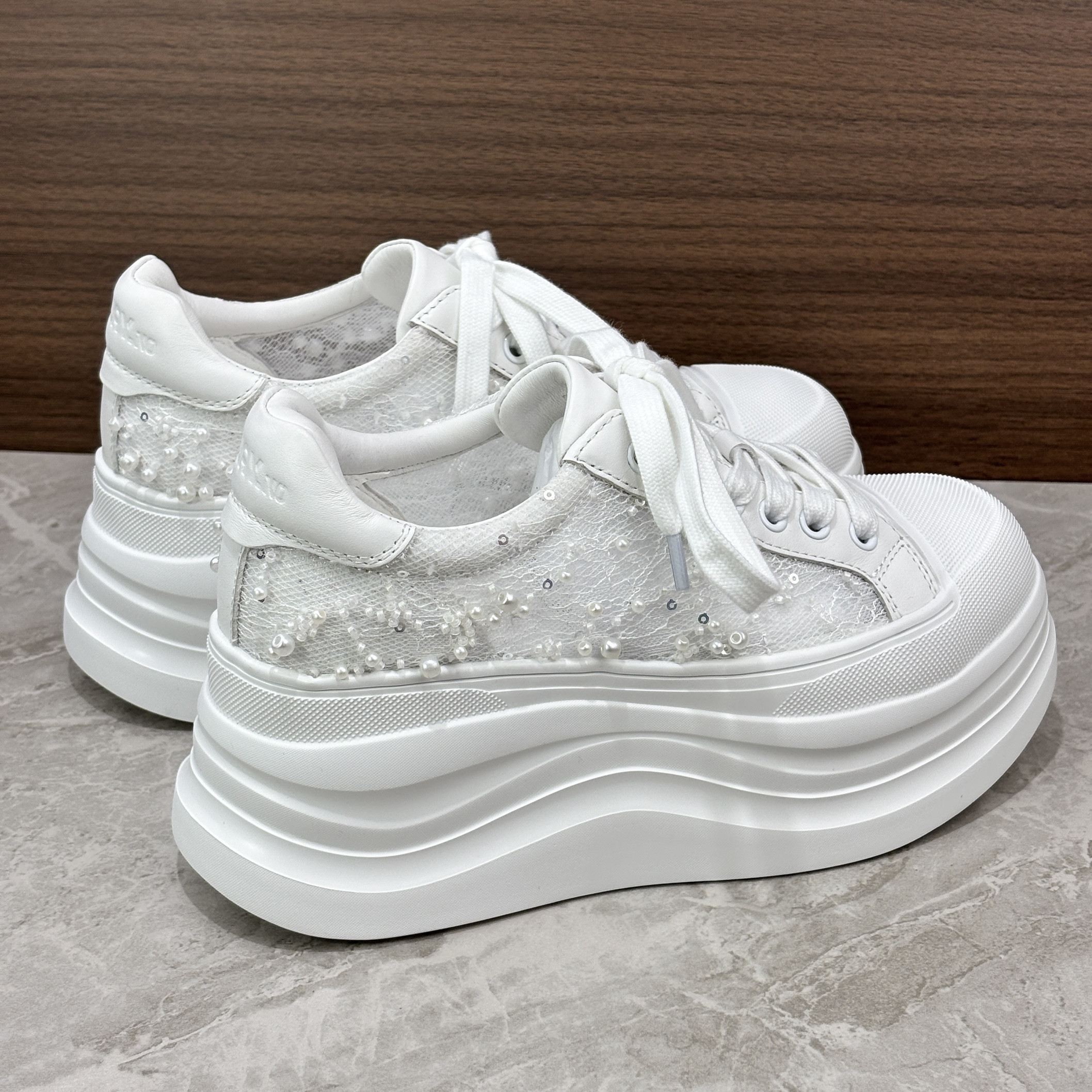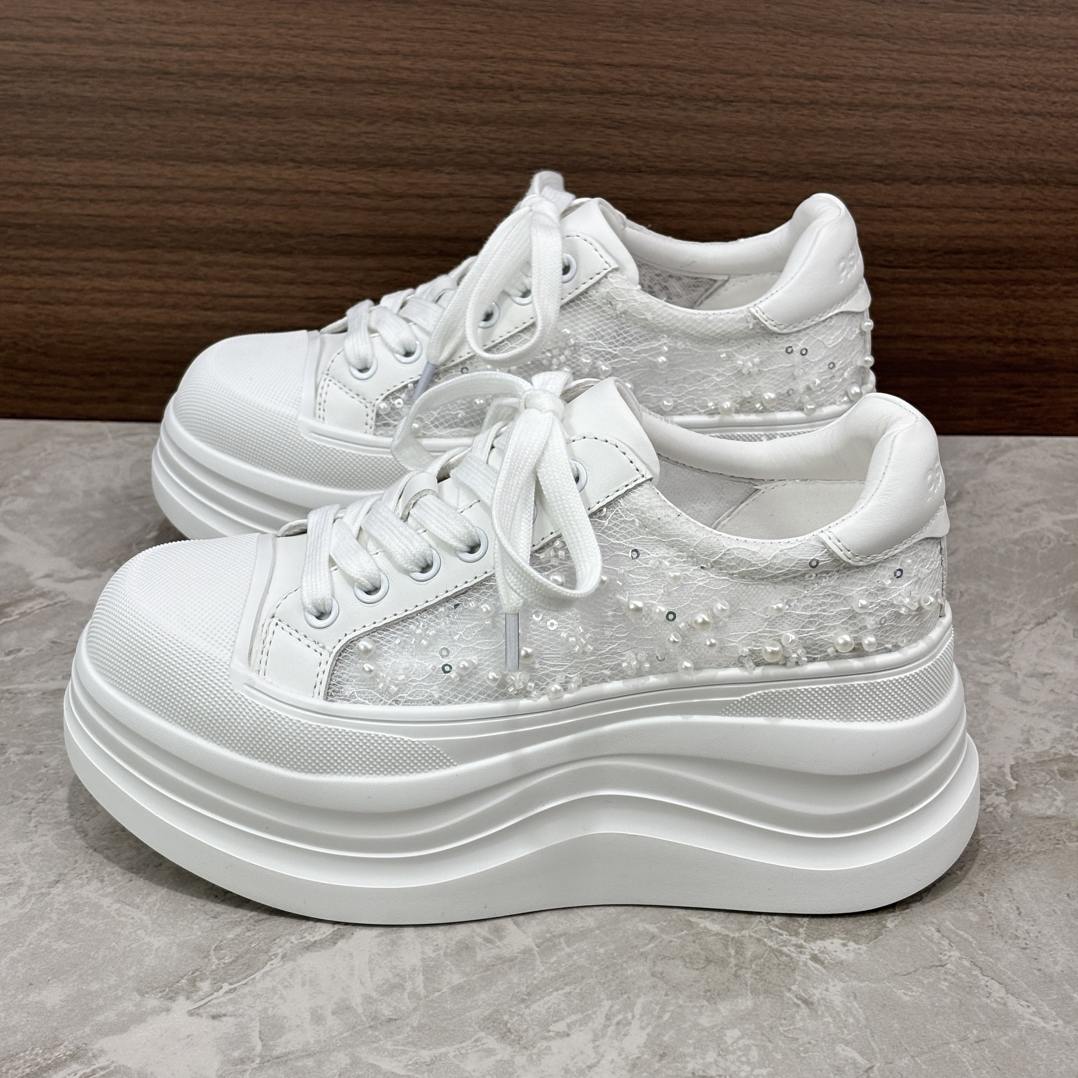 欧洲站2026夏季新款真皮白色厚底松糕鞋透气蕾丝网面增高小白鞋女