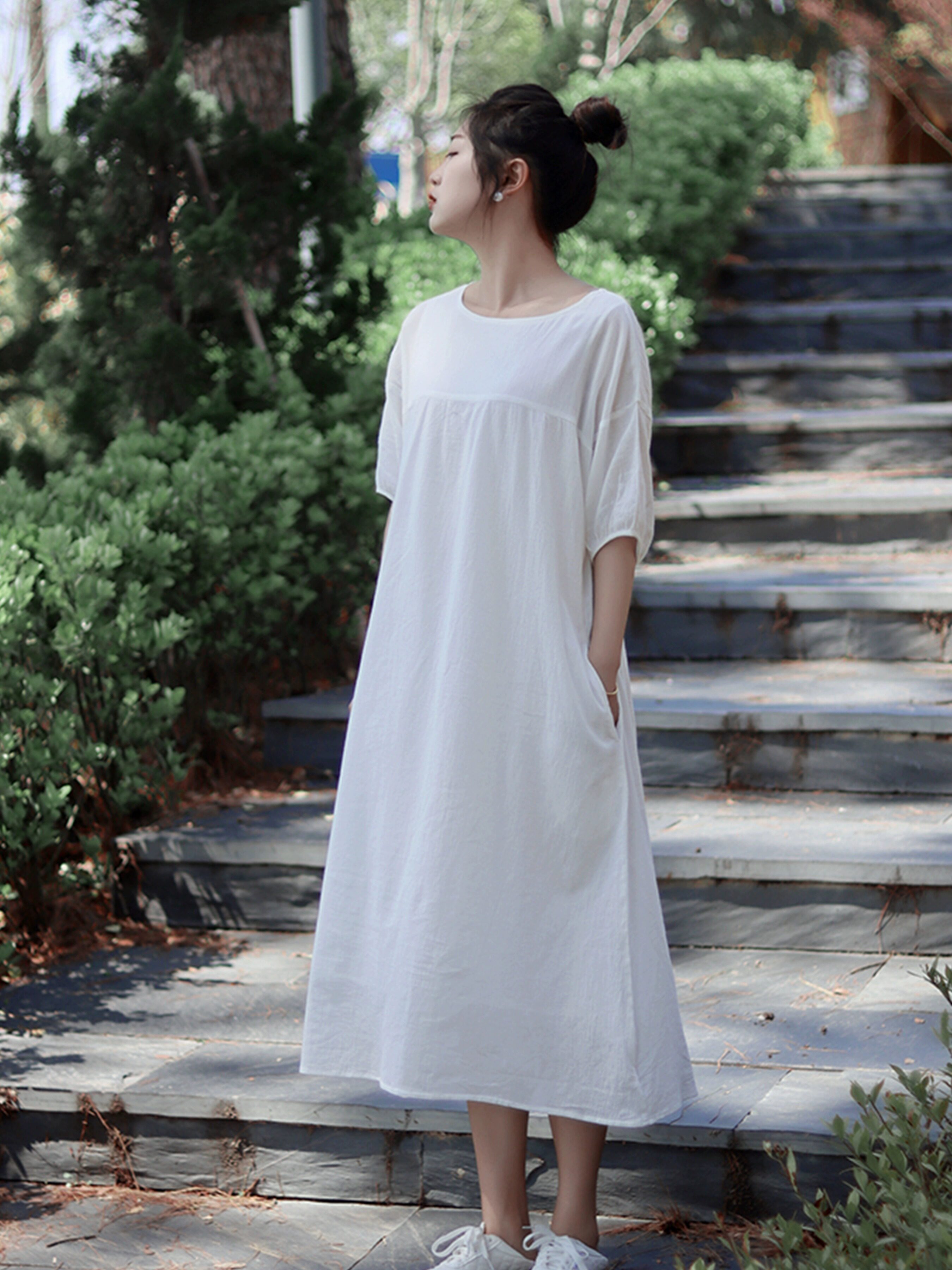 白色仙气苎麻连衣裙女海边度假气质飘逸长裙棉麻文艺宽松中长裙