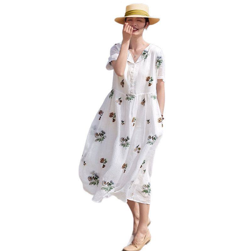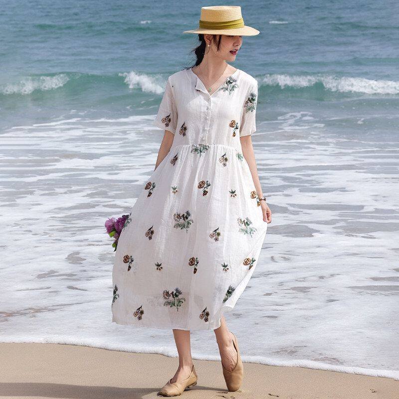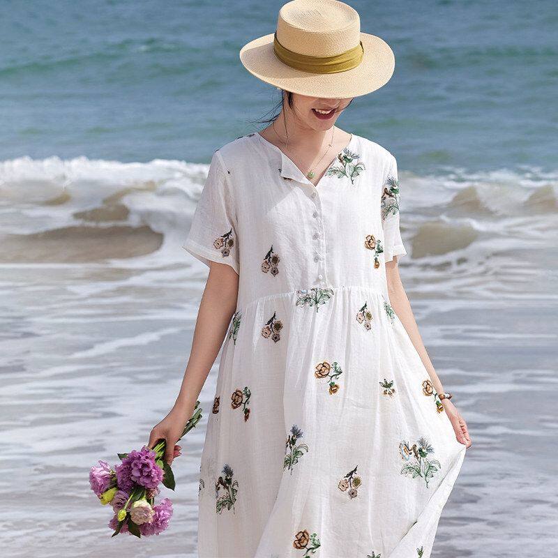 2026夏季新款白色刺绣连衣裙女海边度假苎麻碎花宽松长裙飘逸仙气