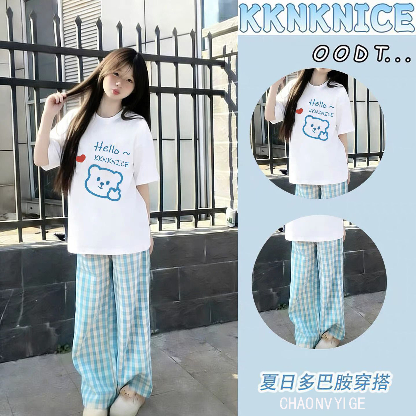 ins闺蜜穿搭姐妹T恤夏天女款2026新款套装女宽松蓝色格纹阔腿裤子
