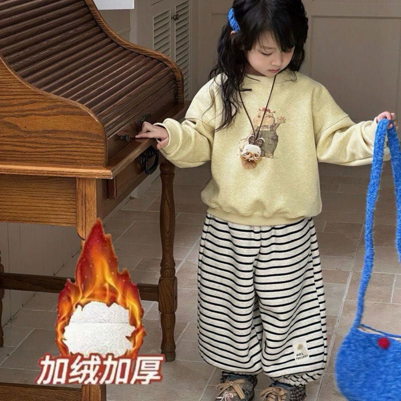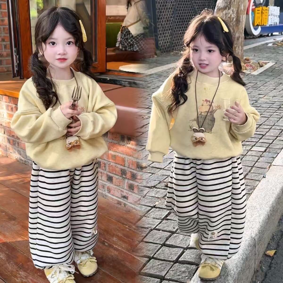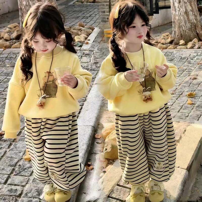 女童秋冬套装加绒卫衣2025新款女宝宝加厚上衣韩版条纹卫裤两件套