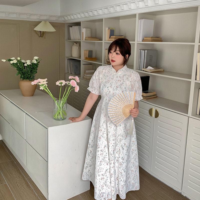 2025夏季新品230斤加大码女装长裙旗袍200胖mm国风蕾丝碎花连衣裙