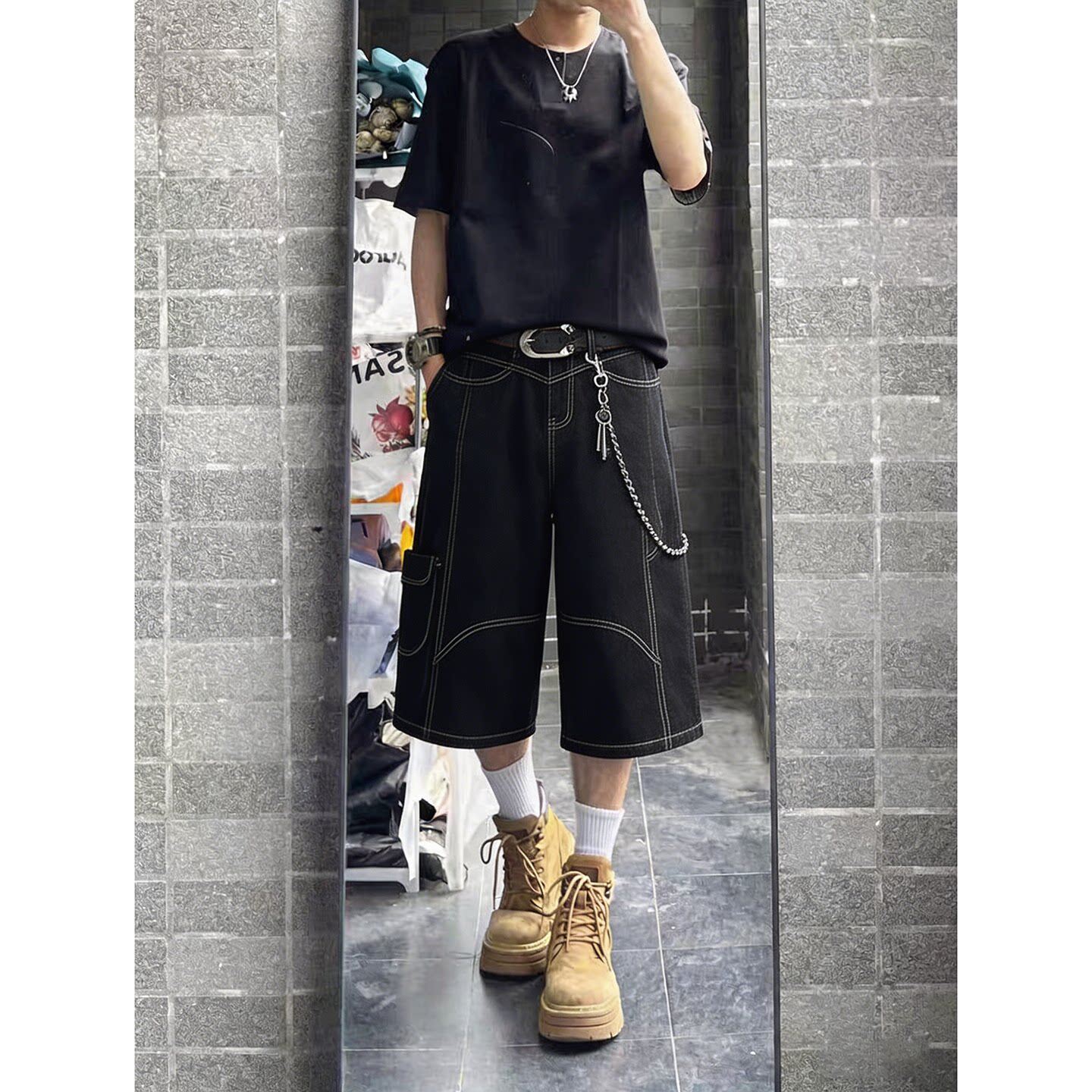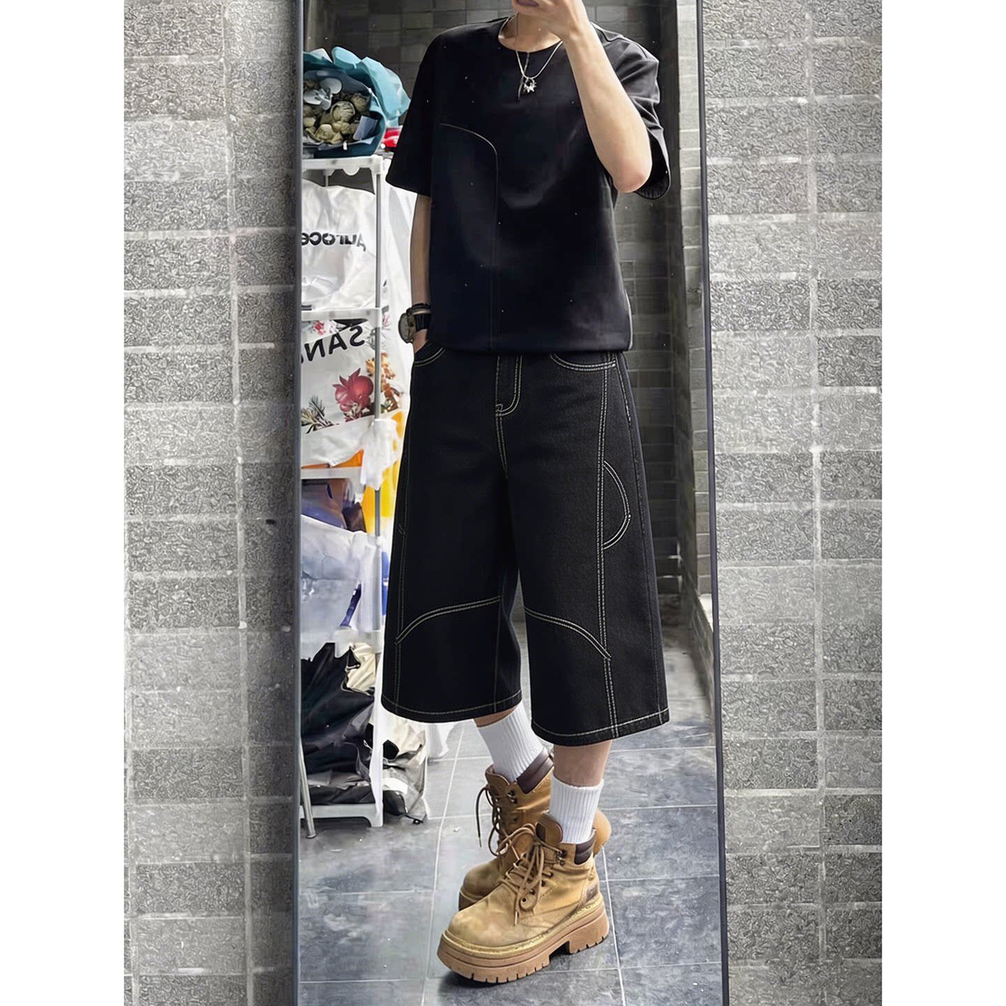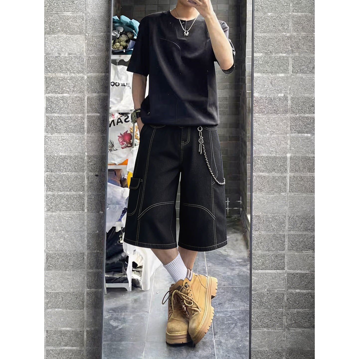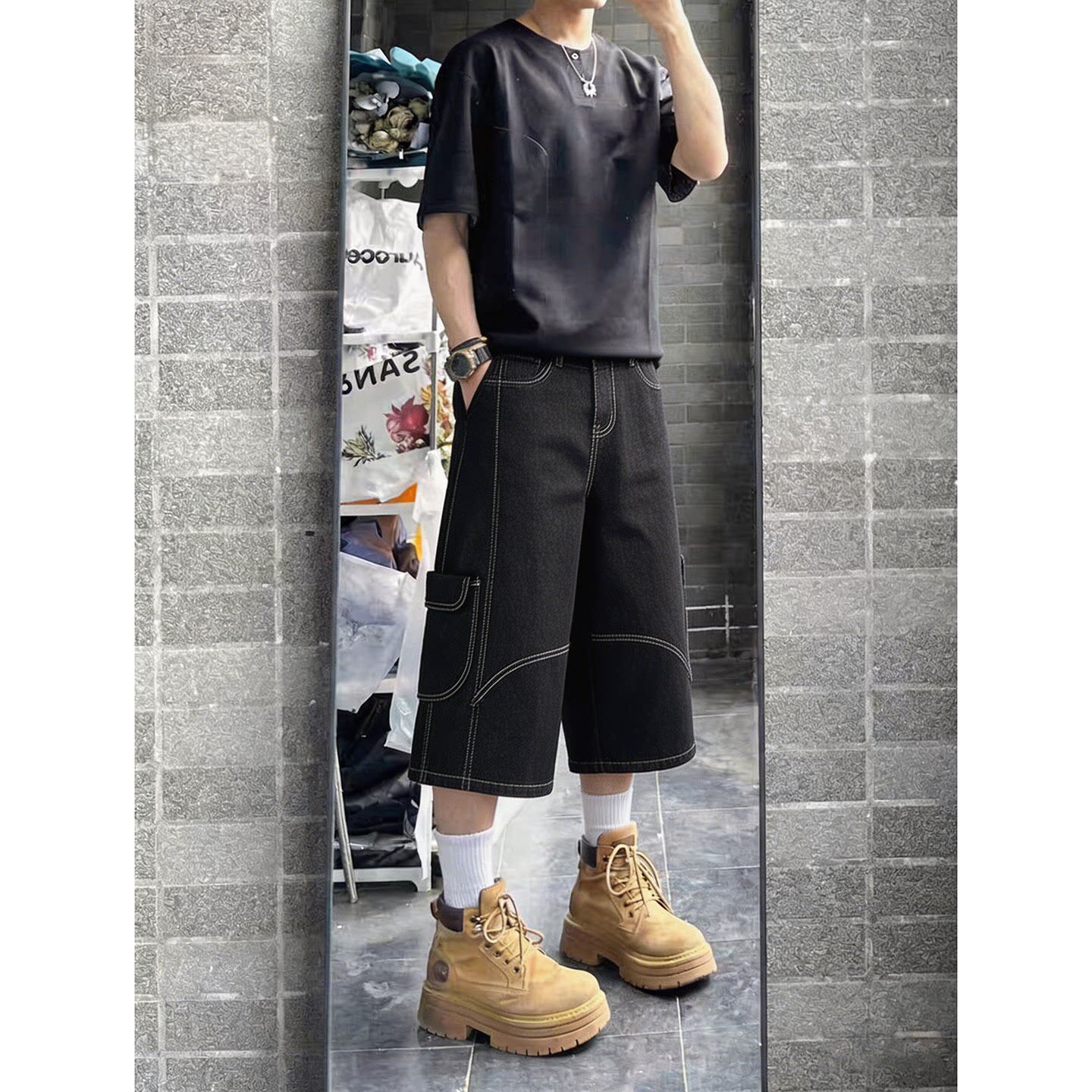 黑色解构明线牛仔七分裤子男款夏多口袋工装短裤cleanfit阔腿中裤