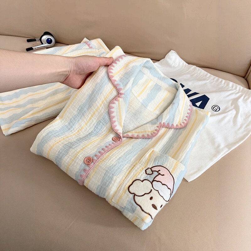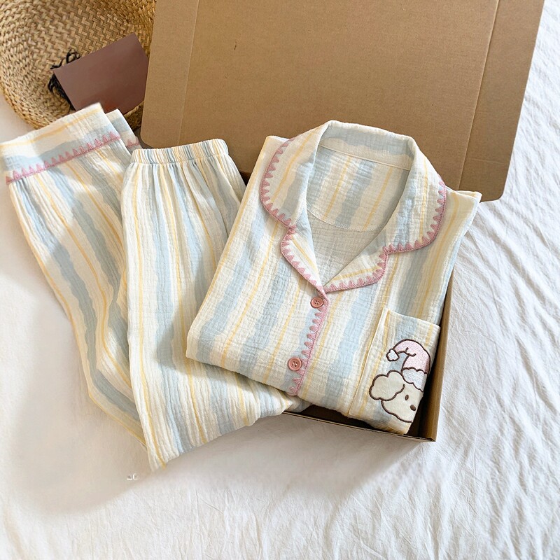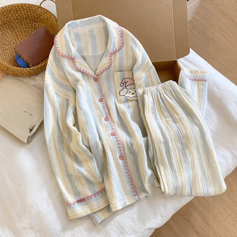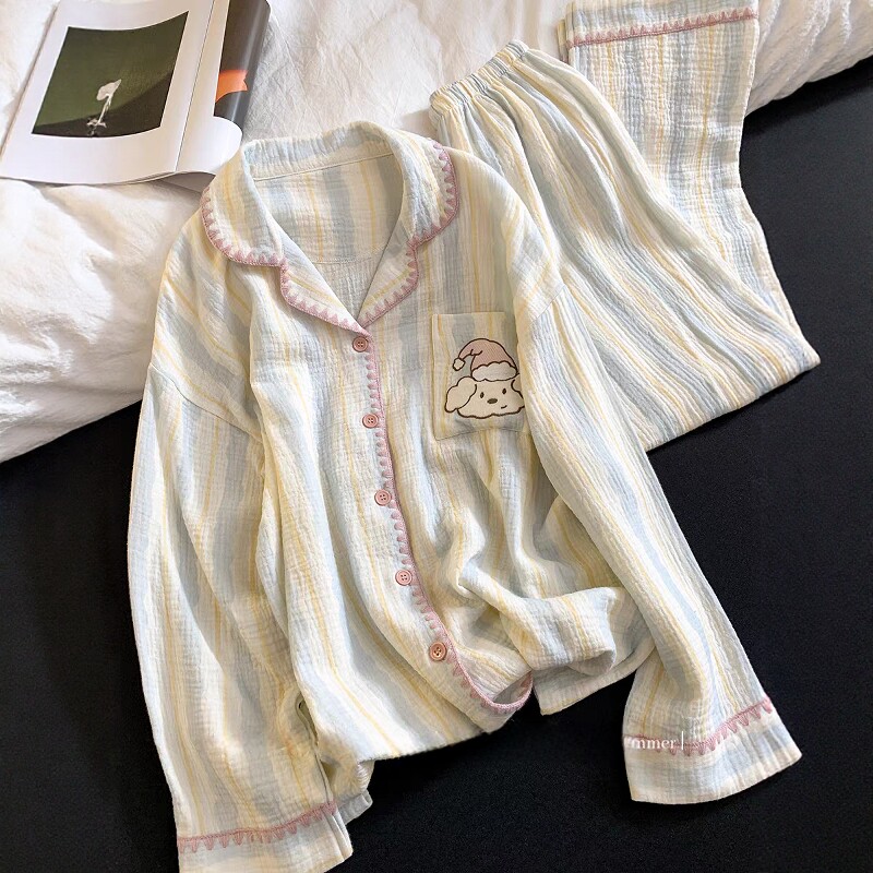 条纹小狗2025新款睡衣女款春秋季双层纯棉纱布卡通学生长袖家居服