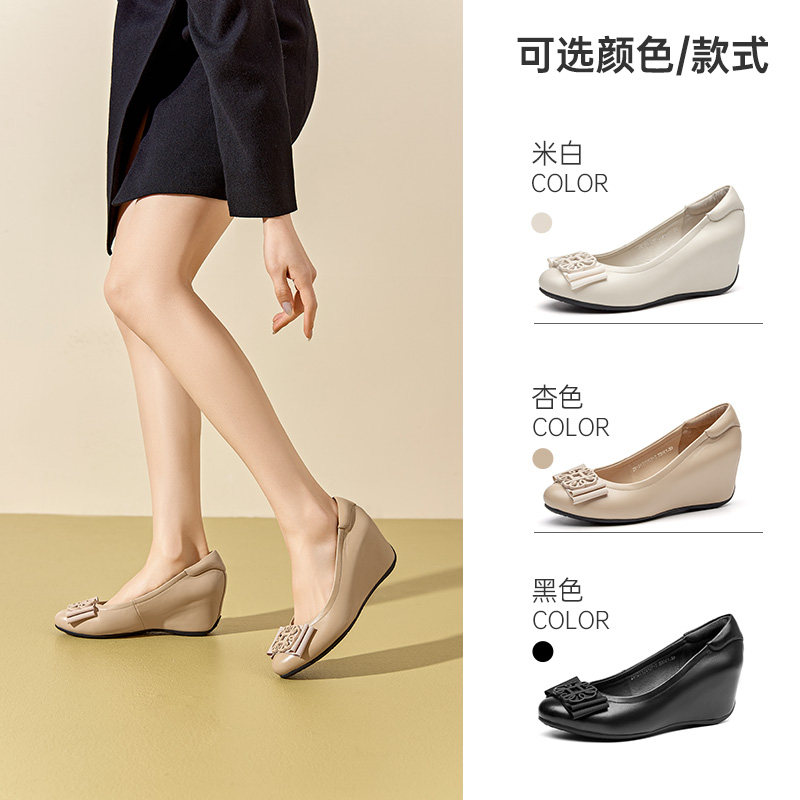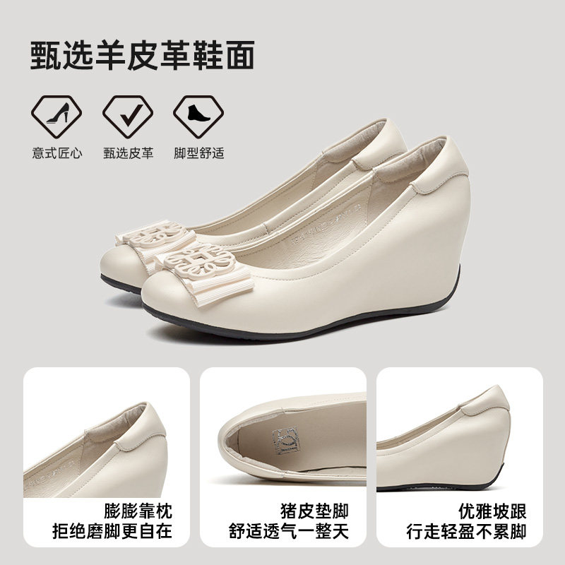【商场同款】羊皮单鞋女坡跟内增高女鞋春季新款舒适妈妈皮鞋