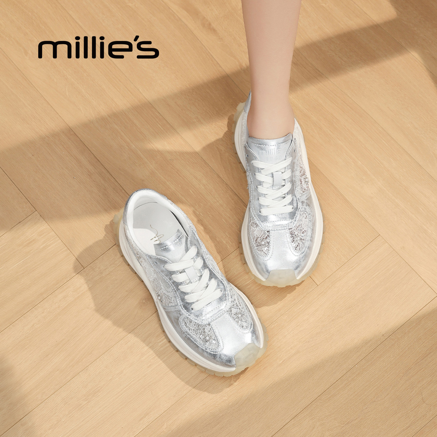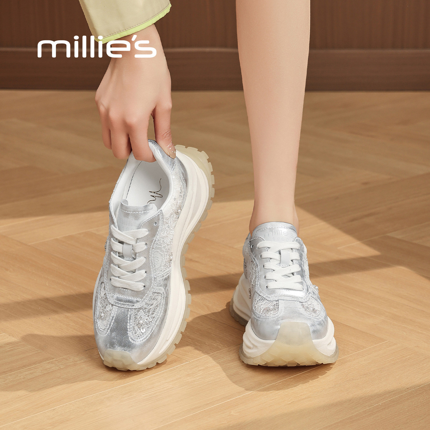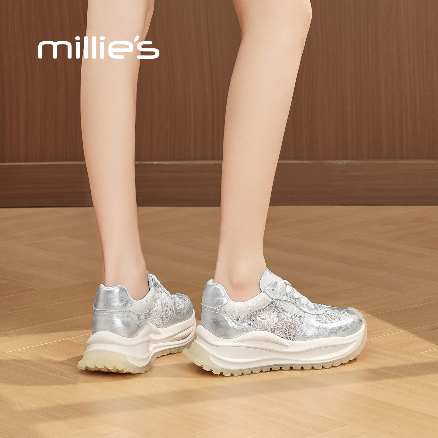MILLIE'S/妙丽蕾丝透气增高老爹鞋女2026春夏新款低帮运动休闲鞋