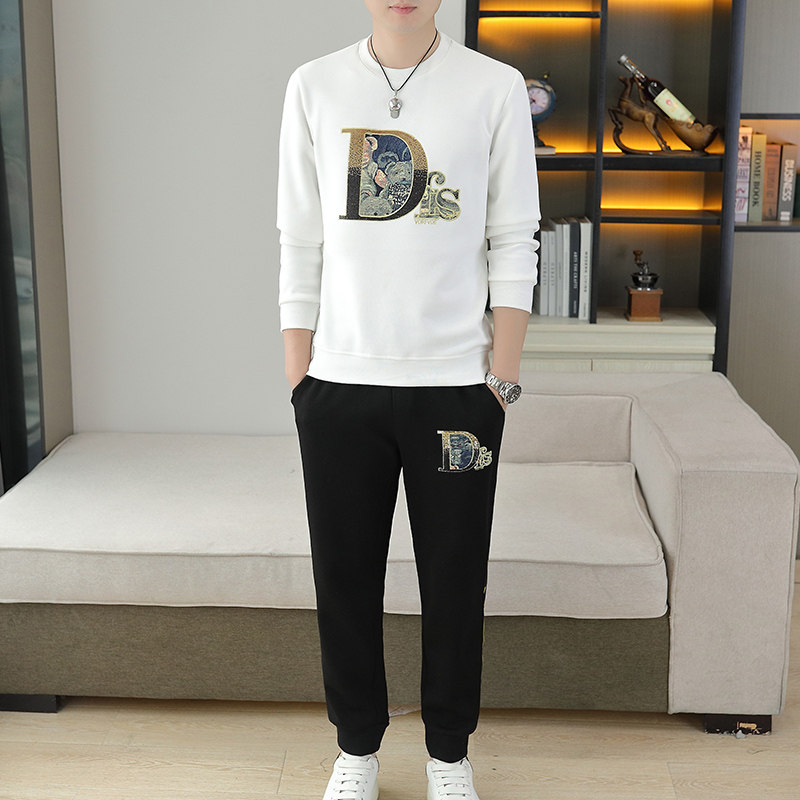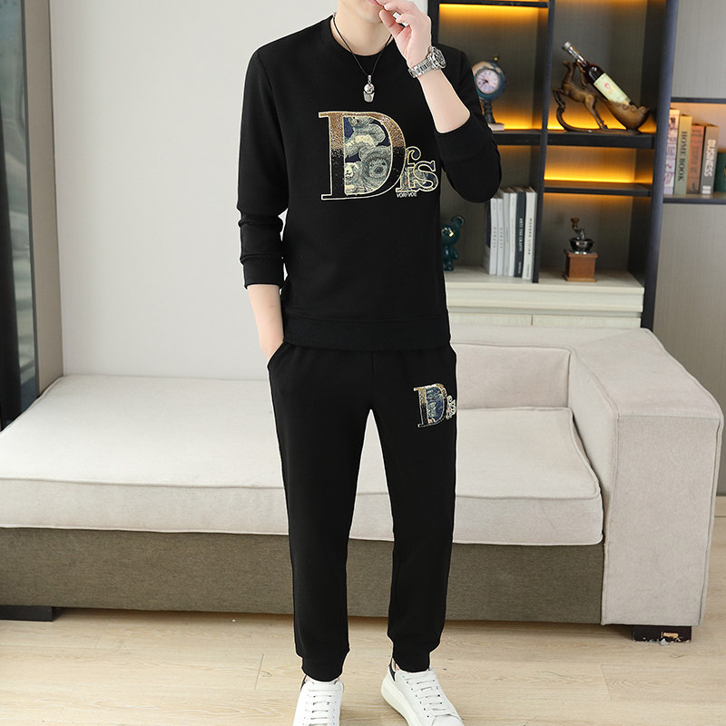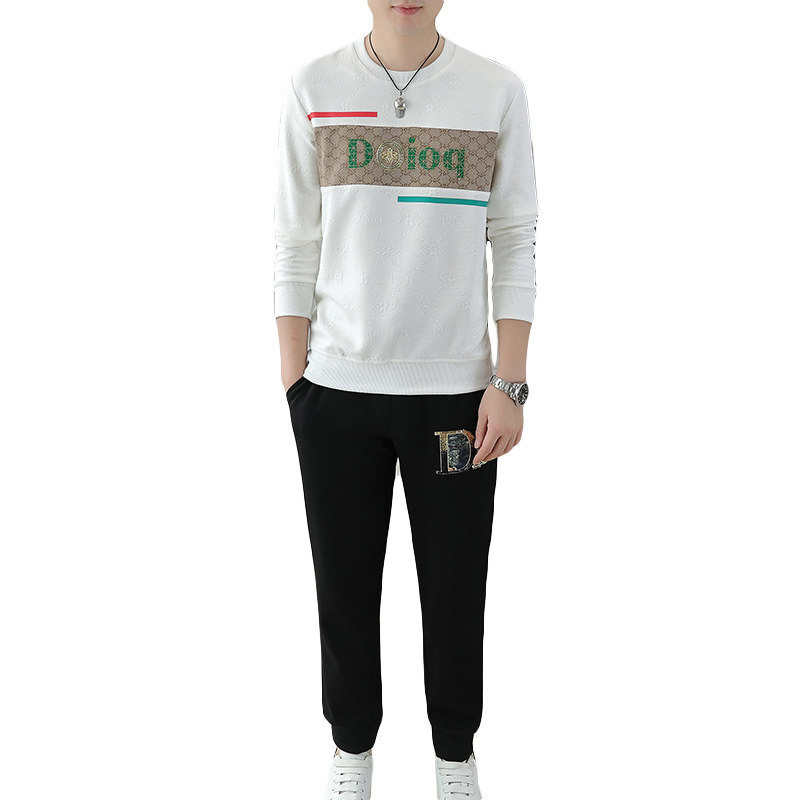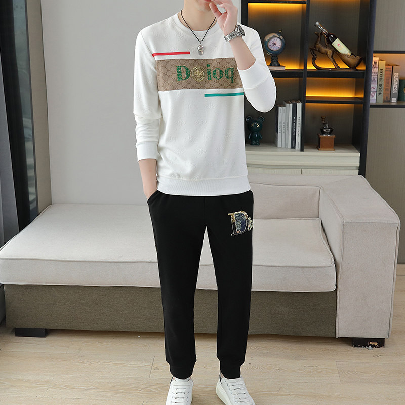 秋季男士T恤短袖短裤长袖厚棉T套装2023新款青少年潮流长裤两件套