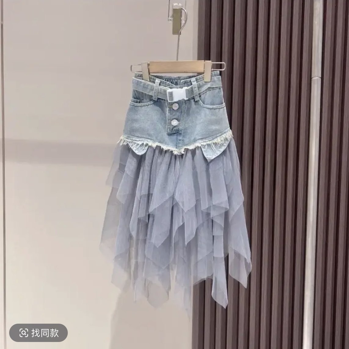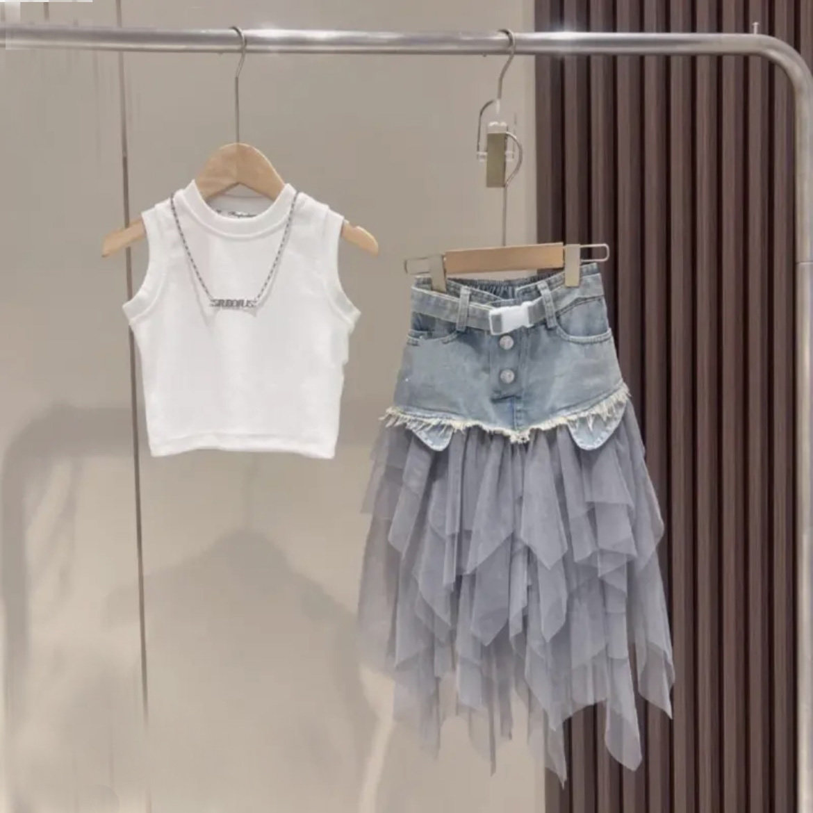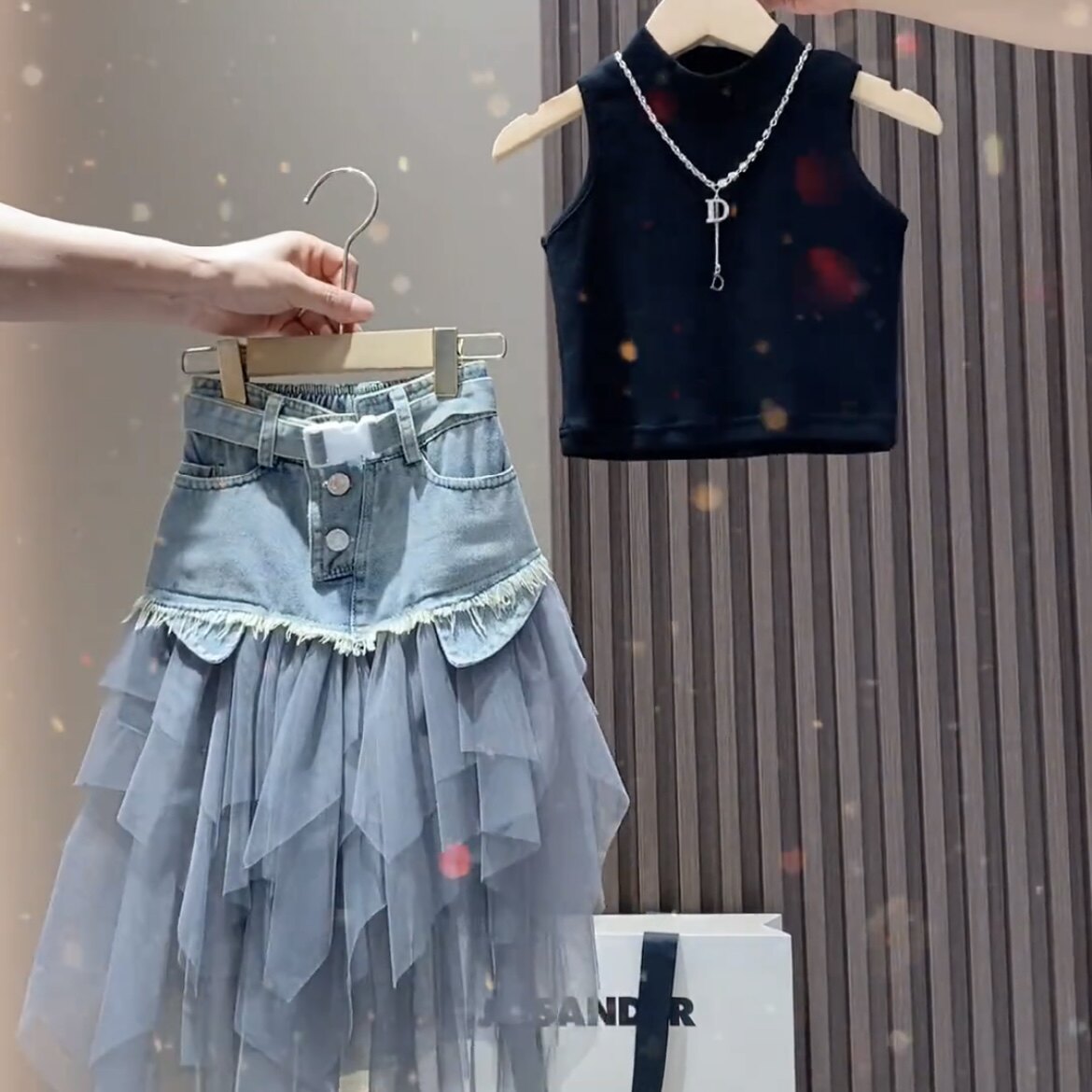 童装女童夏季套装2026新款韩版洋气无袖背心网纱拼接牛仔半身裙潮
