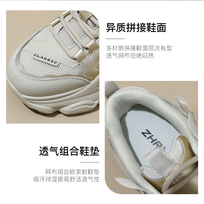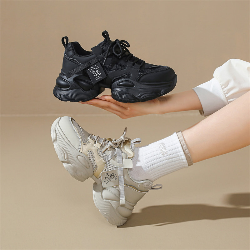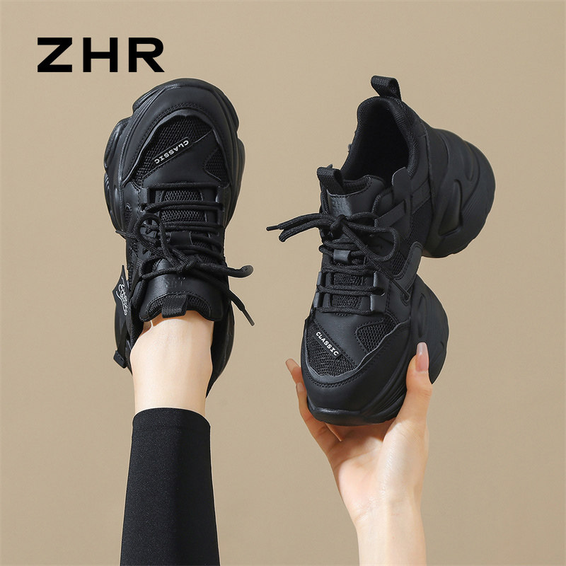 黑色老爹鞋女2025新款春夏网面透气厚底显脚小真皮运动鞋休闲女鞋