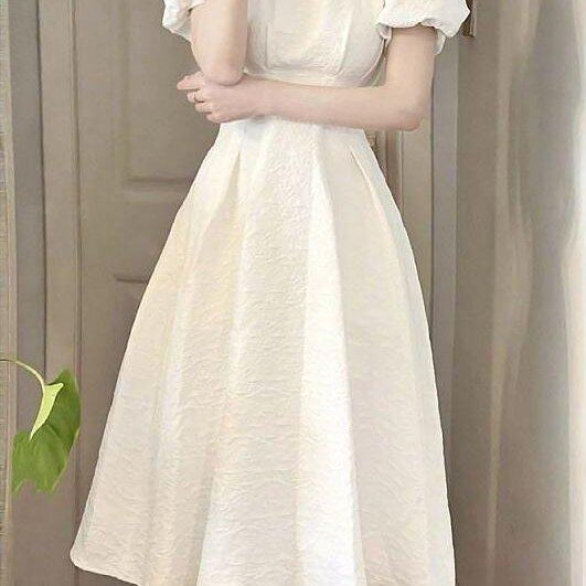 双层有里布中长款连衣裙2023夏季新款泡泡袖仙女A字连衣裙