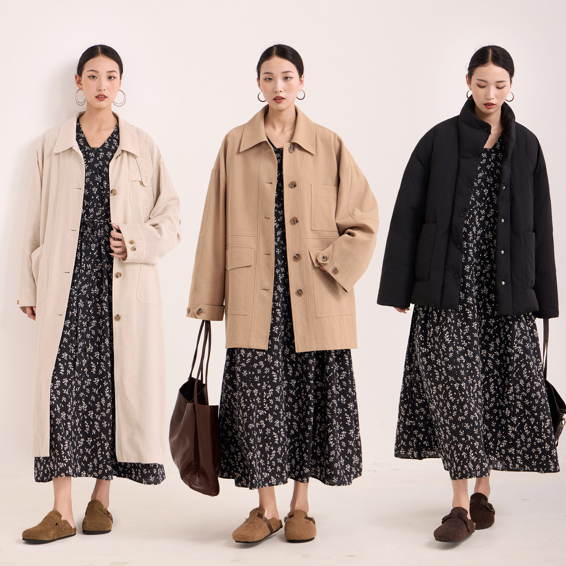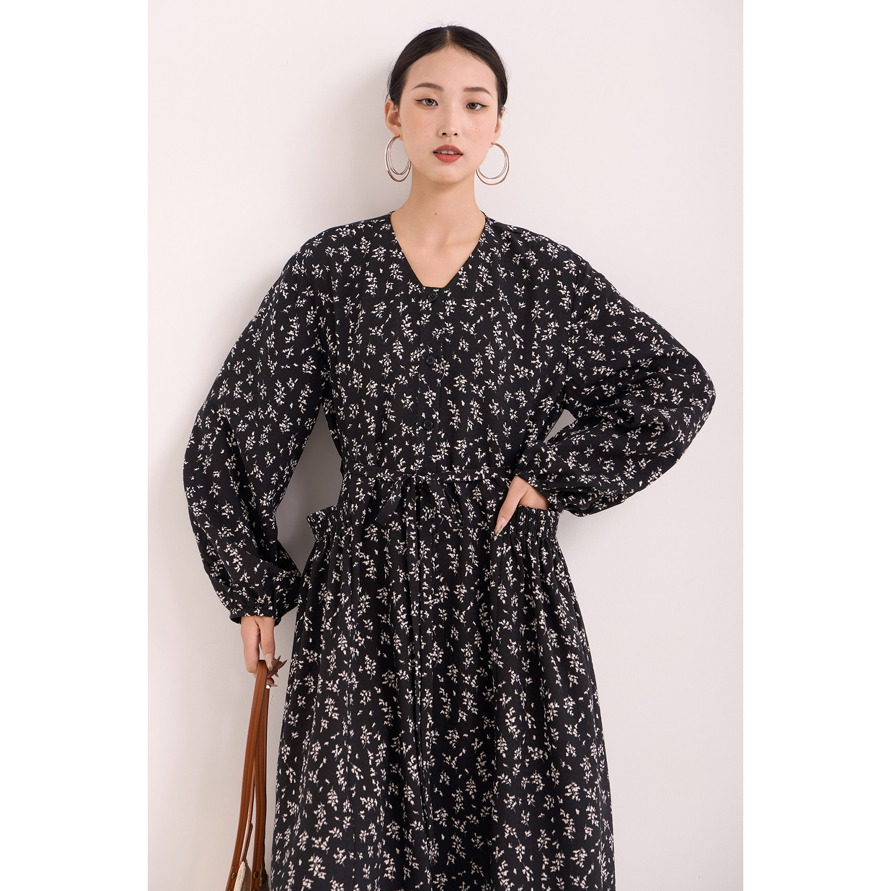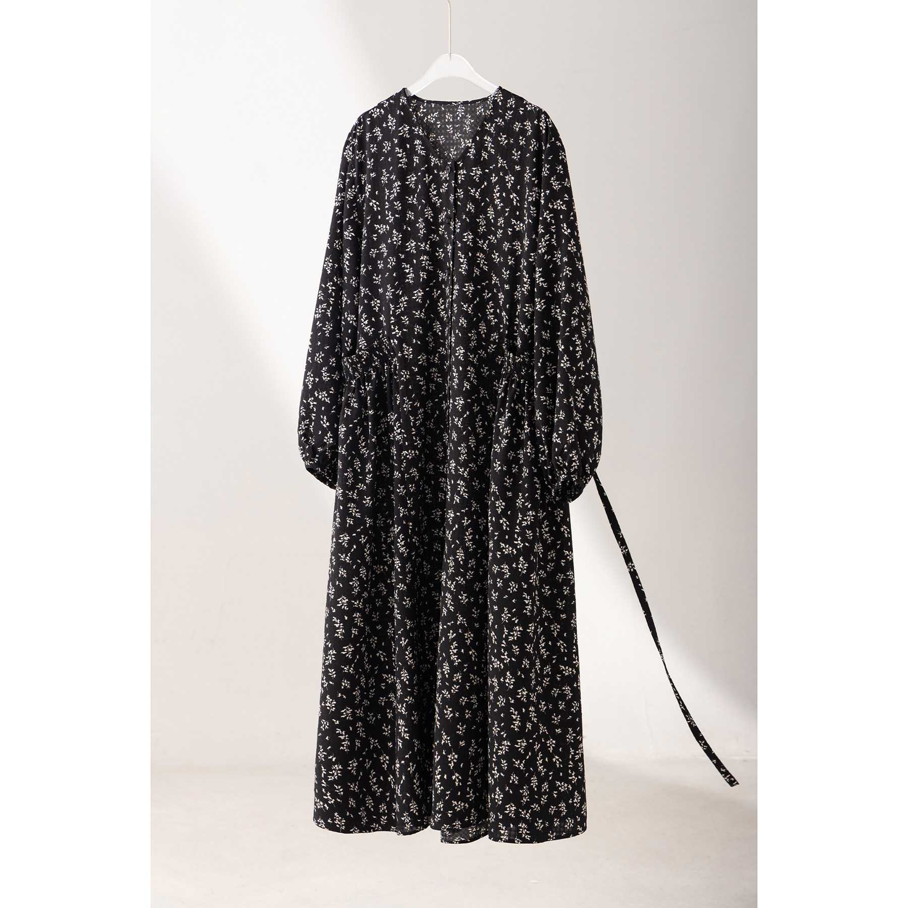 碎花连衣裙女2026春秋新款宽松长袖印花裙收腰显瘦气质黑色连身裙