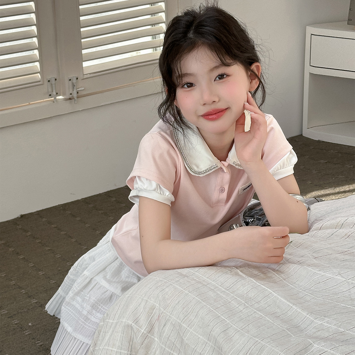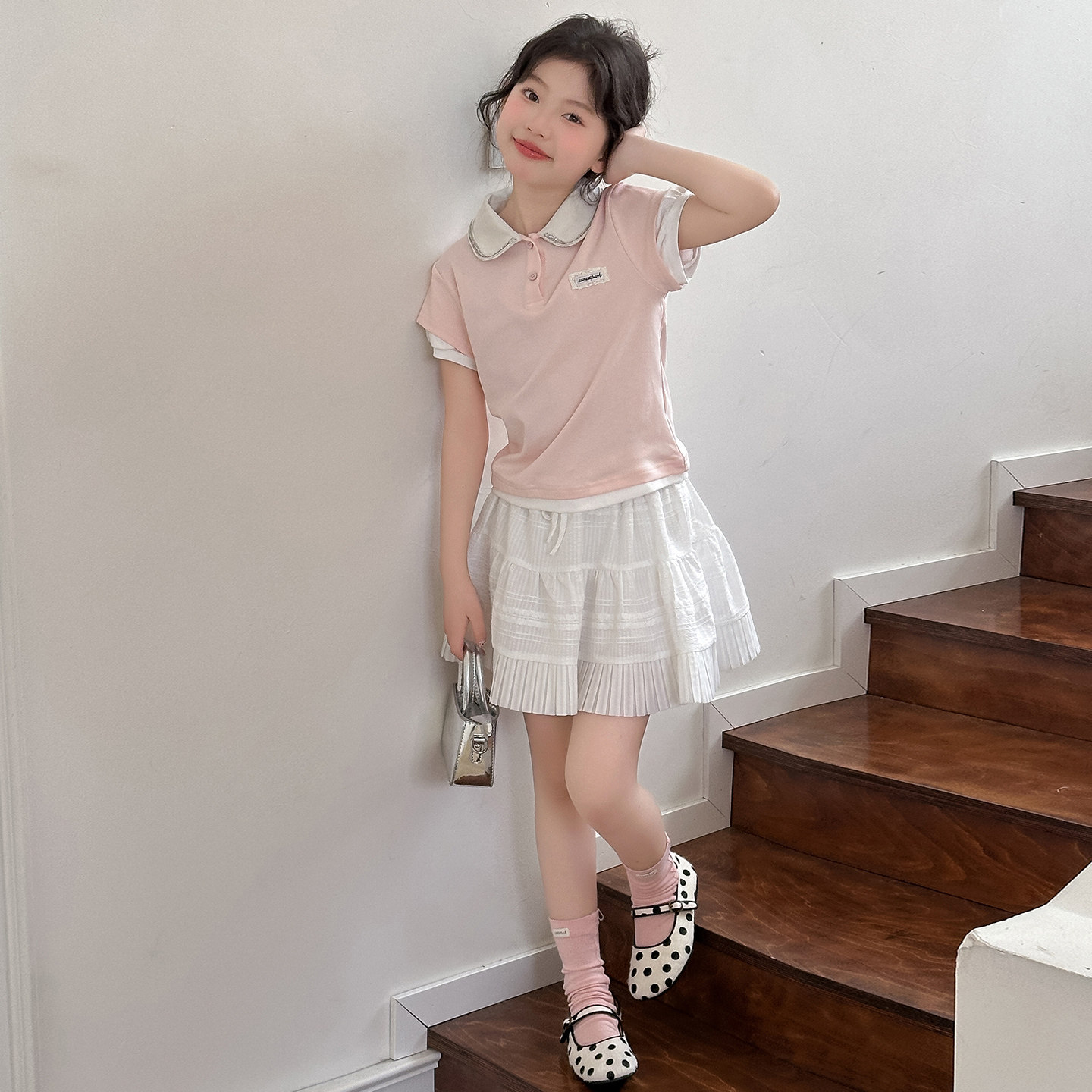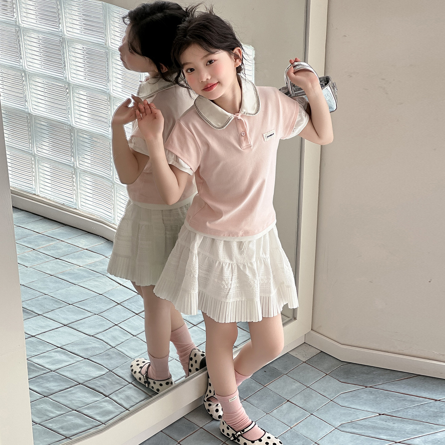 女童夏季甜美风假两件Polo领套装2026女大童夏装短袖儿童百褶裙子