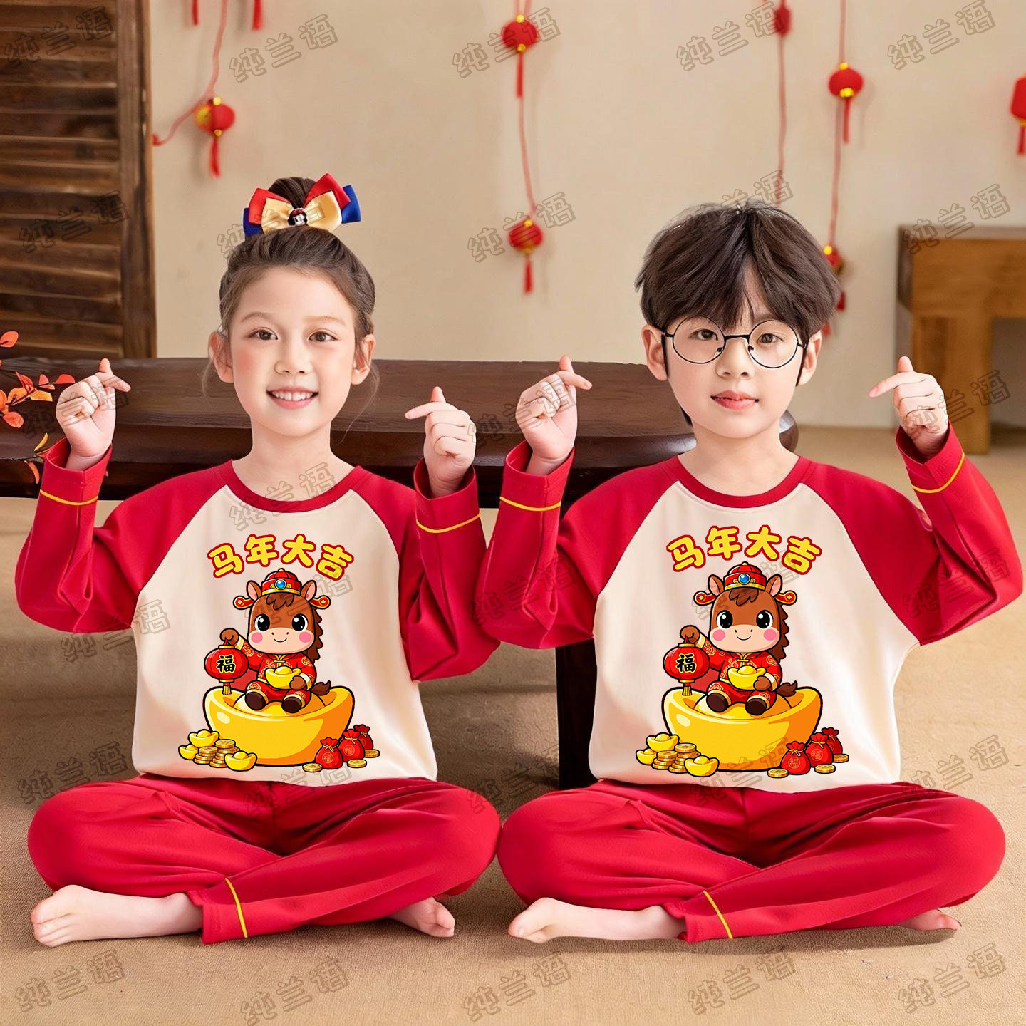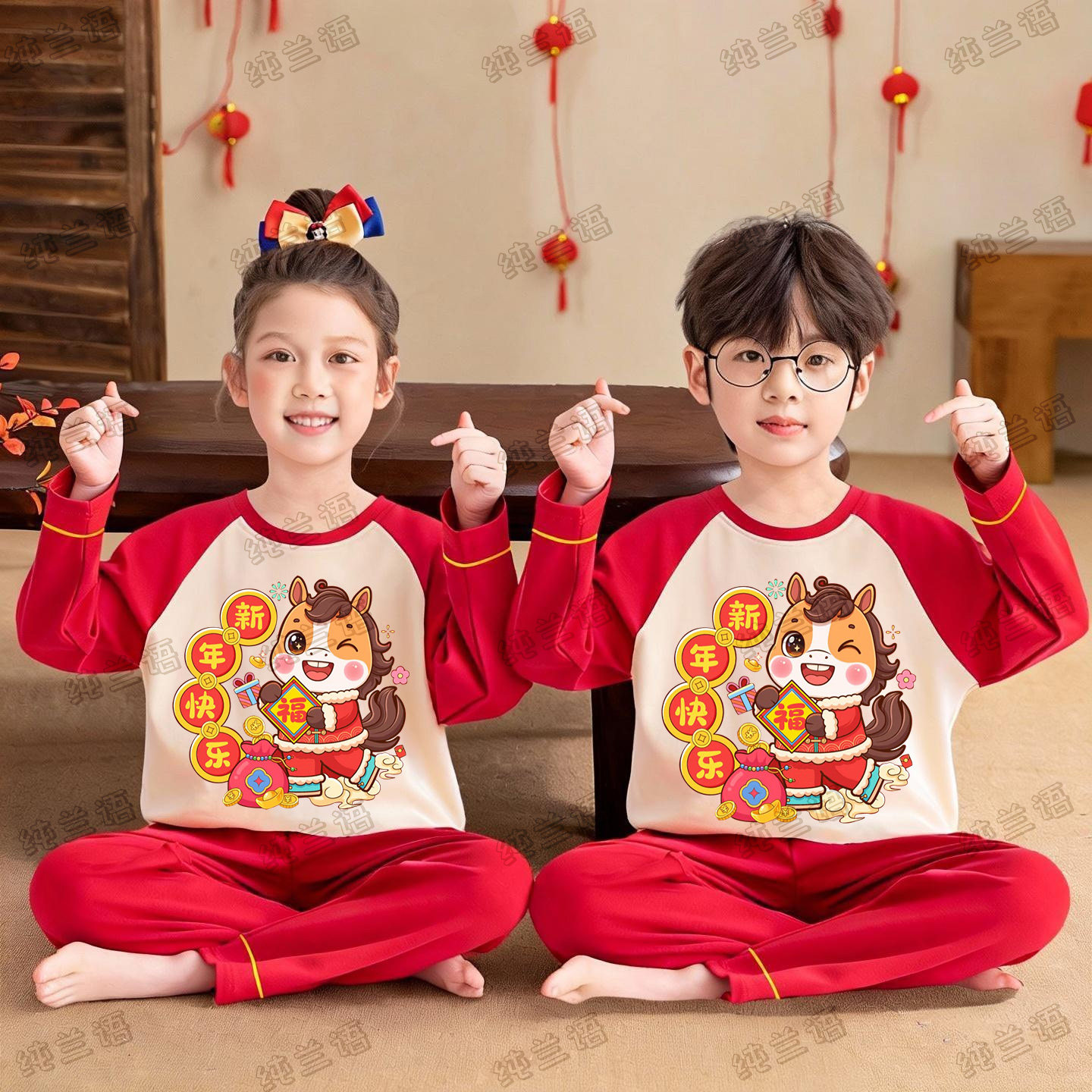 2026新款冬季儿童睡衣红色马年本命年大童男童春秋纯棉家居服女童