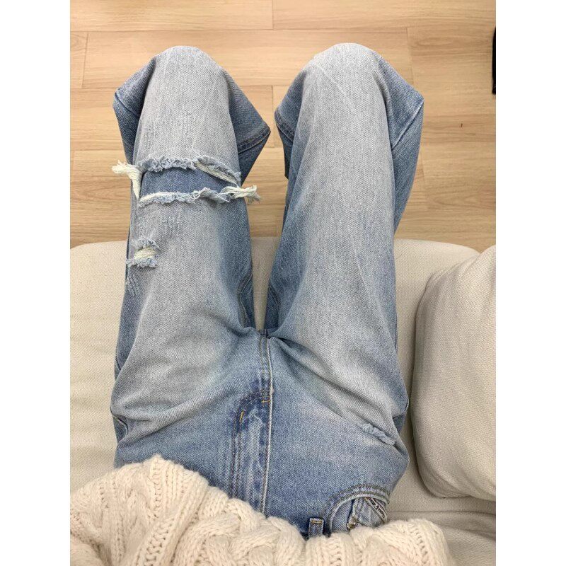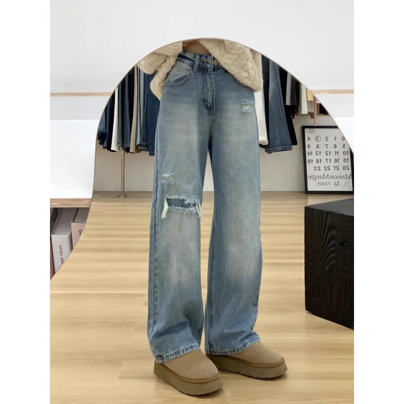 2025新款小个子窄版阔腿裤梨型身材胖mm巨显瘦裤子女款破洞牛仔裤