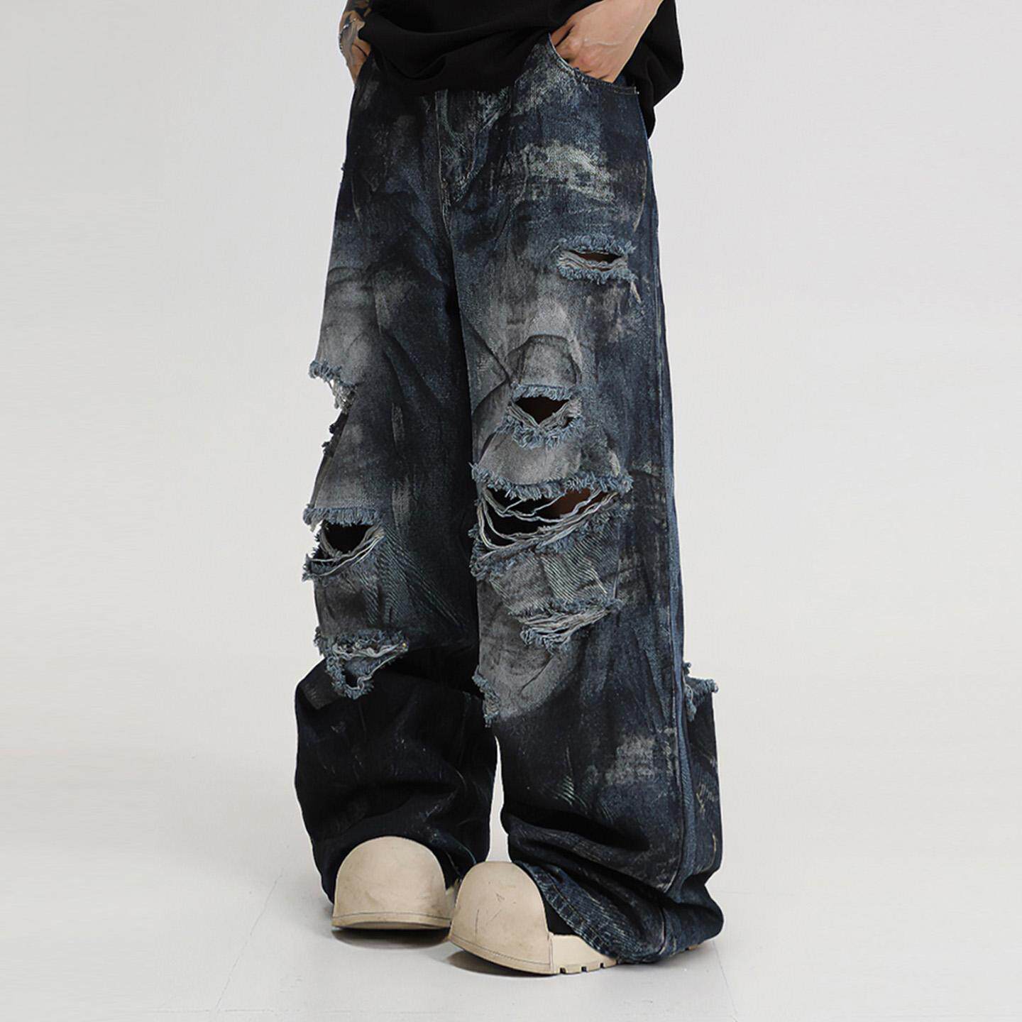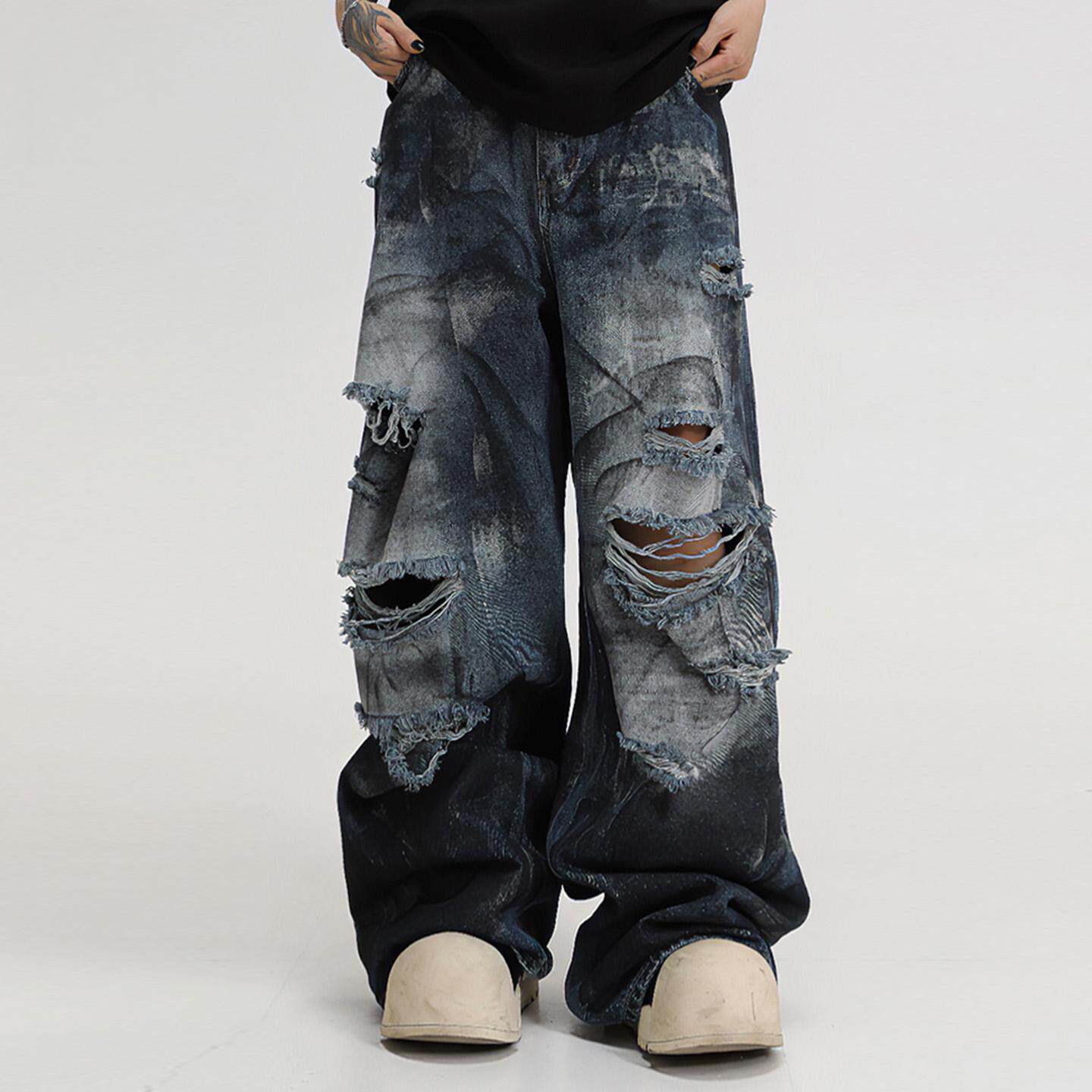 扎染破洞牛仔裤男女款直筒宽松阔腿美式高街裤子潮牌痞帅乞丐长裤