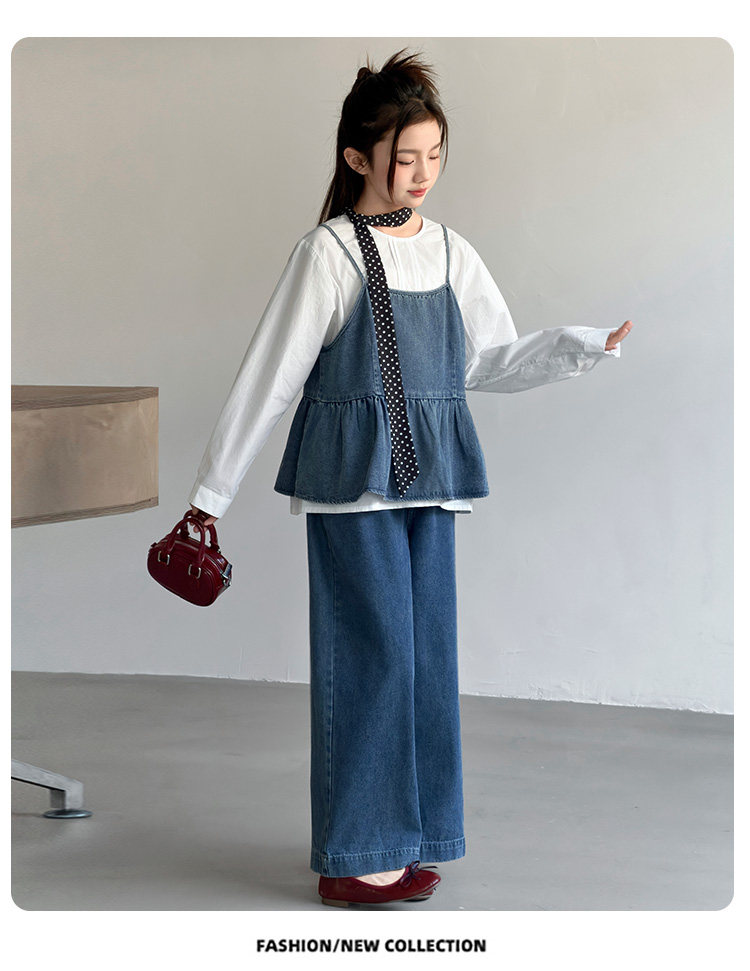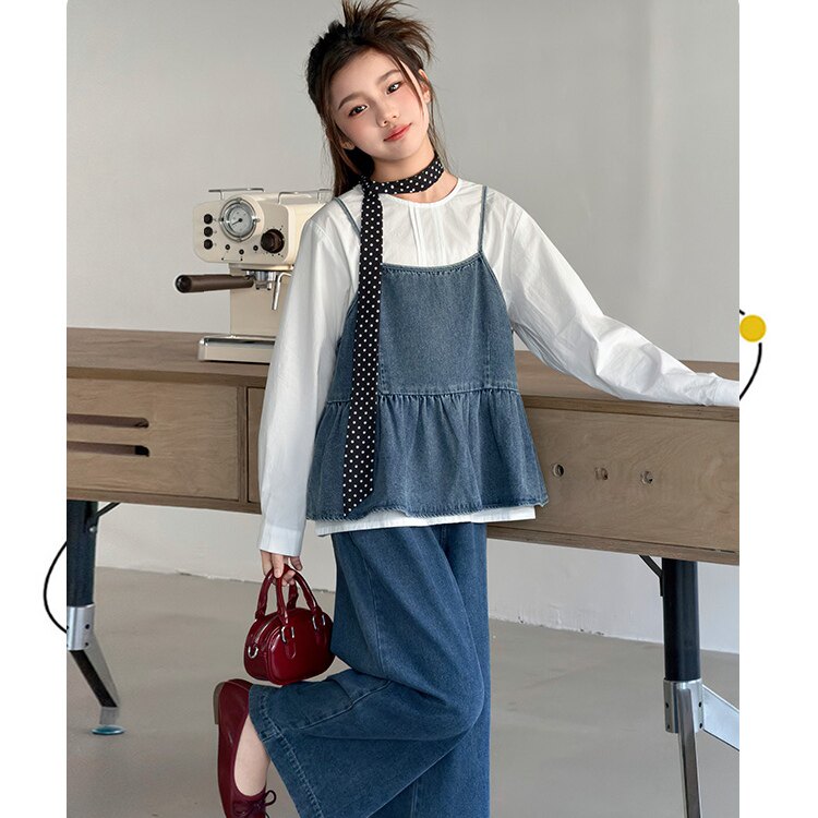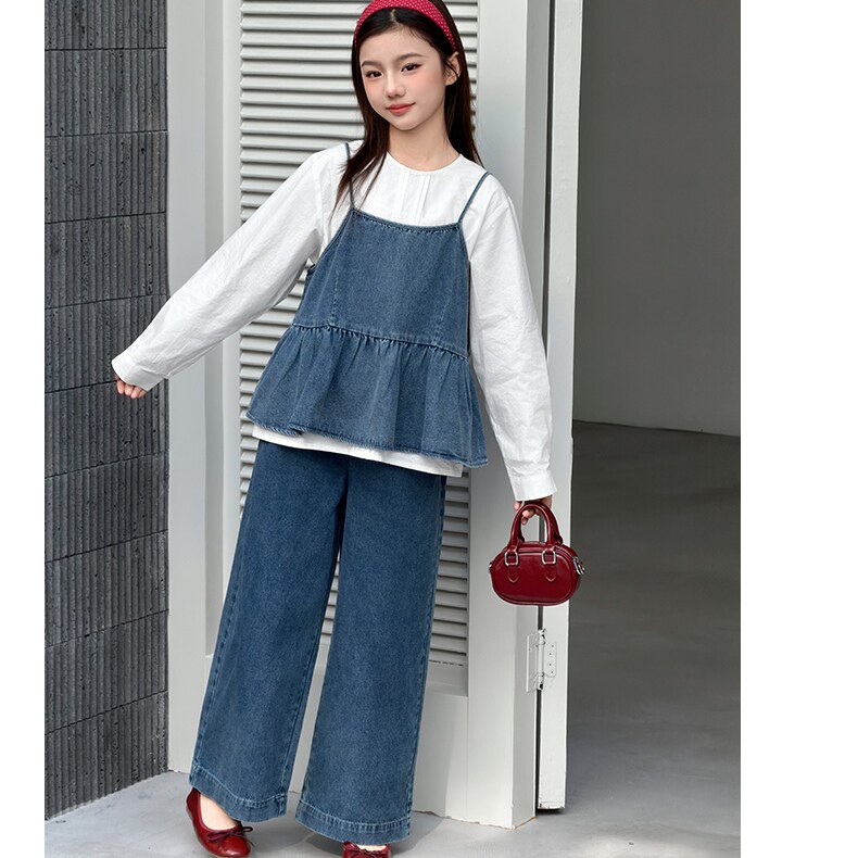 女中大童套装2026新款洋时髦春秋韩牛仔吊带百搭休闲阔腿裤三件套