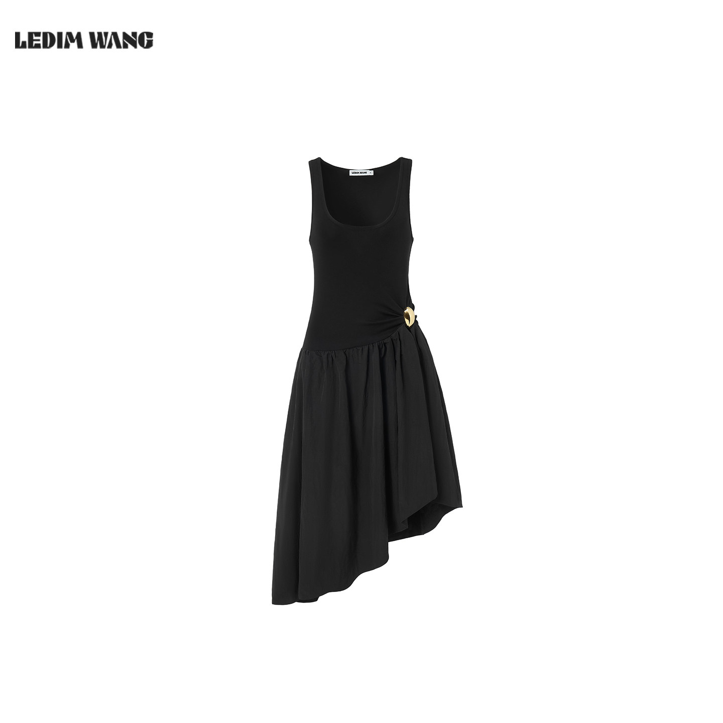 LEDIM WANG金扣拼接背心连衣裙女2026春夏新款黑色收腰裙摆长裙