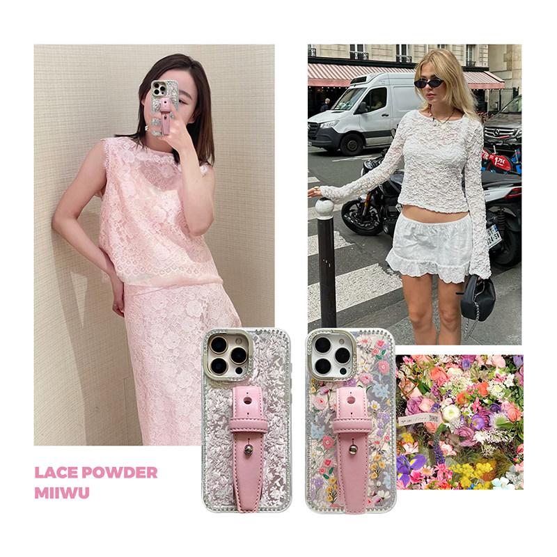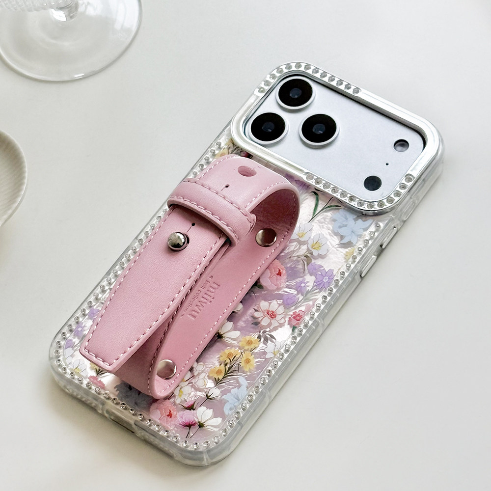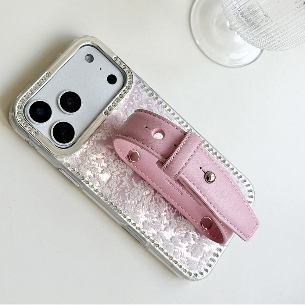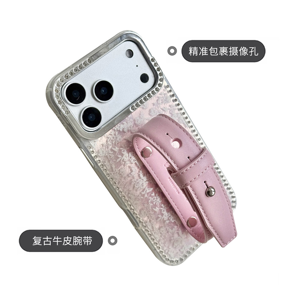 蕾丝纹闪钻镜头少女粉豆豆钉皮带手机壳系列适用苹果17promax手机壳腕带新款iphone16/15系列便携设计