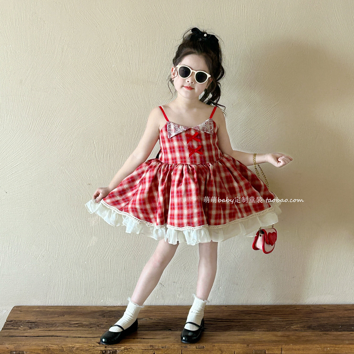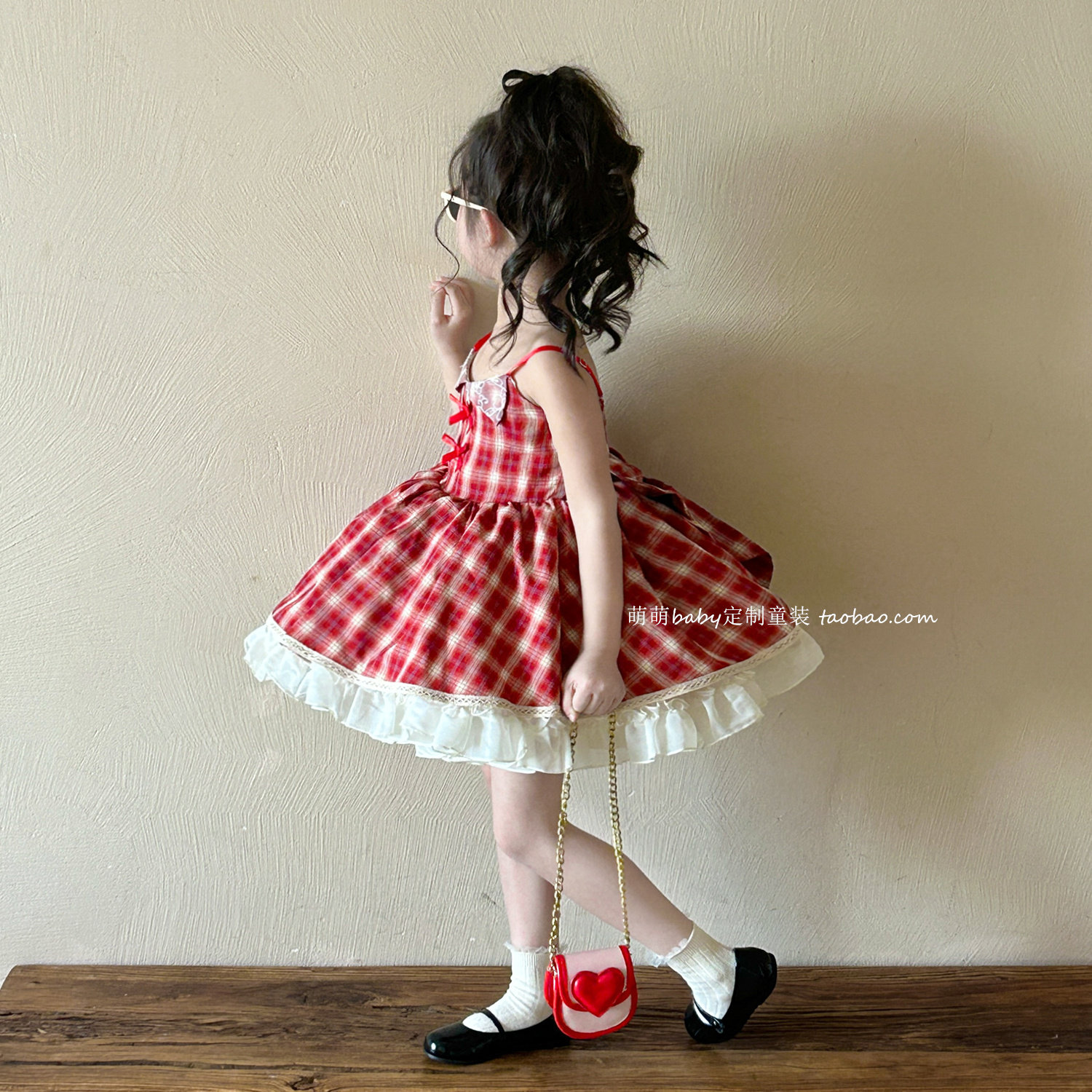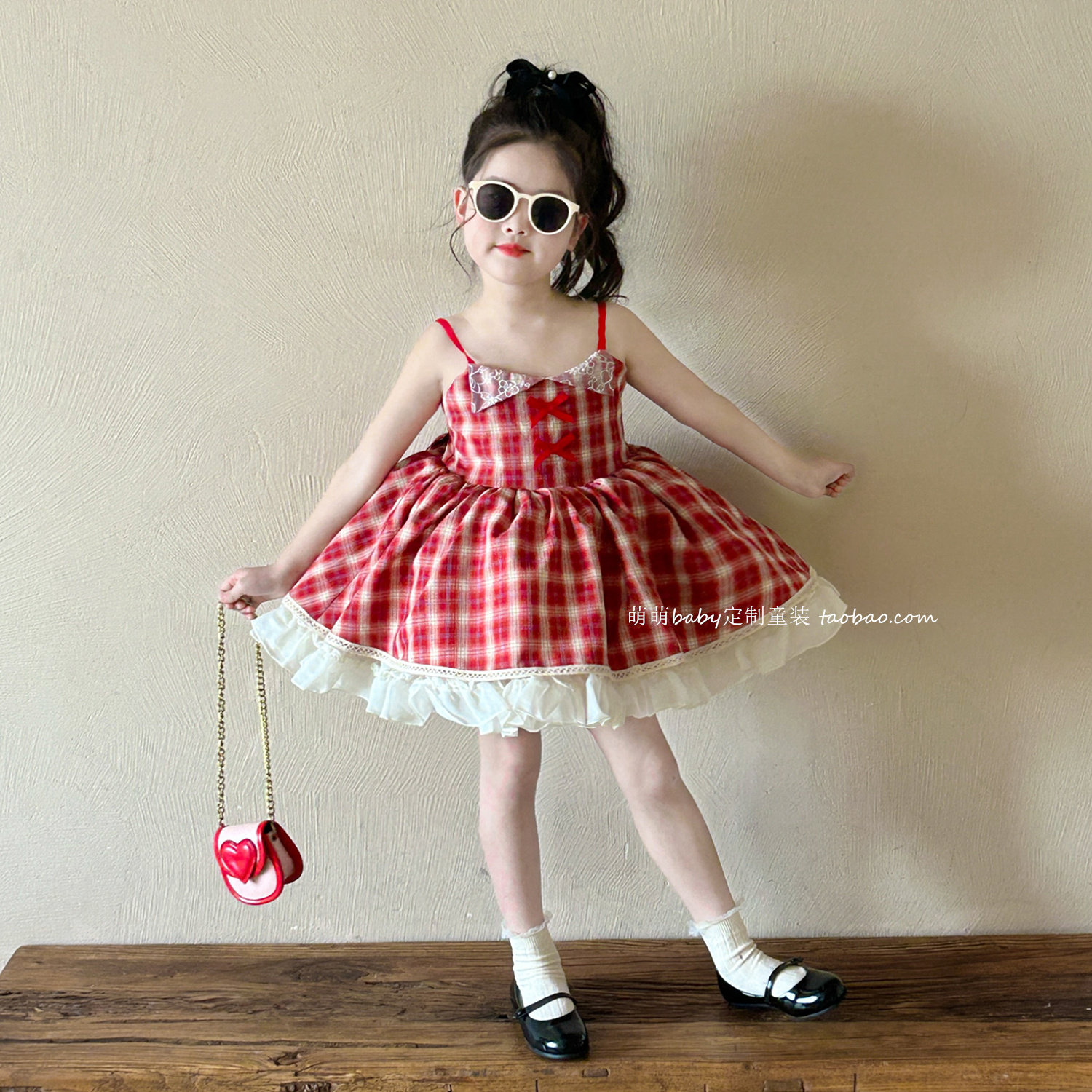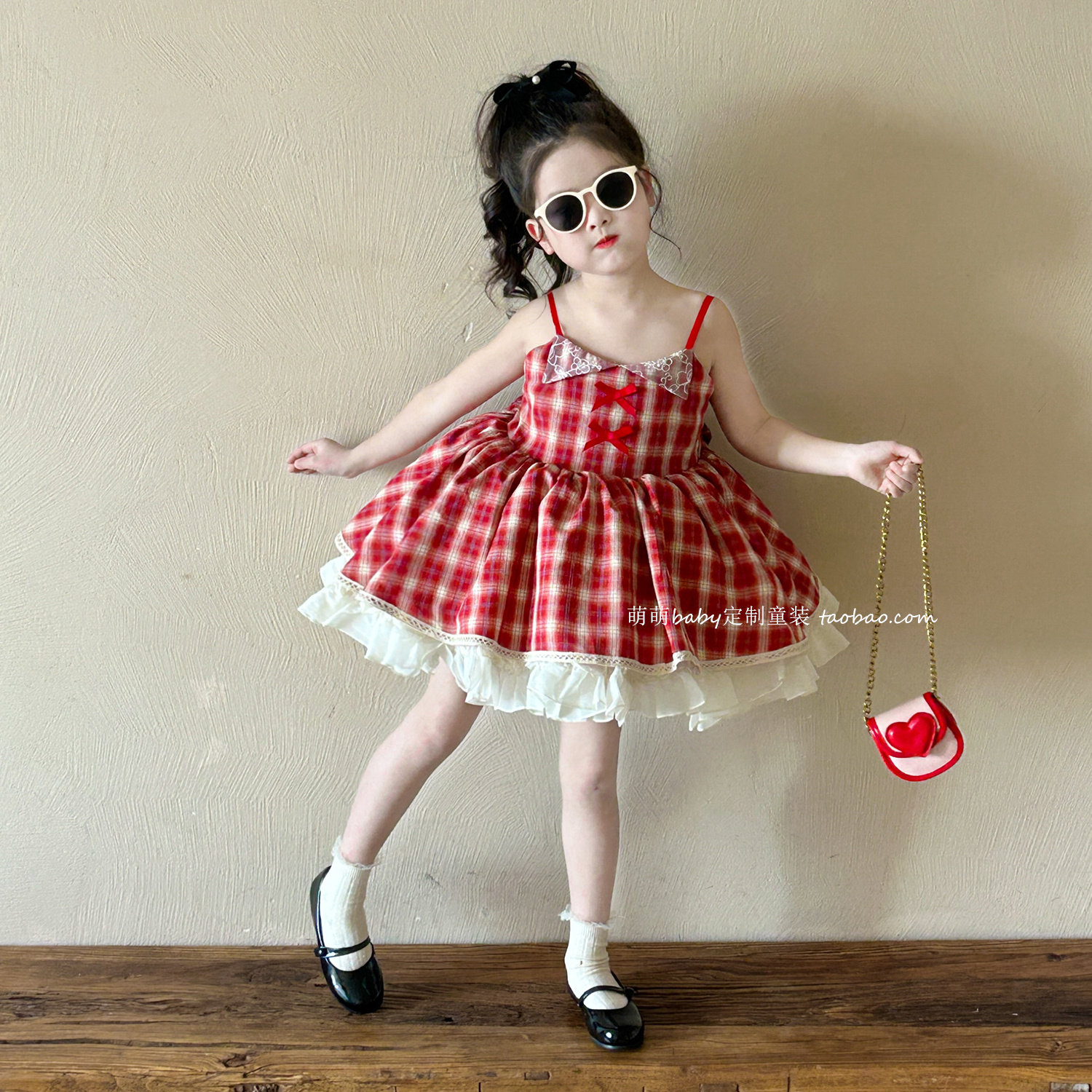 女童洋气红色格子蓬蓬连衣裙2026夏季新款小女孩甜美吊带公主裙