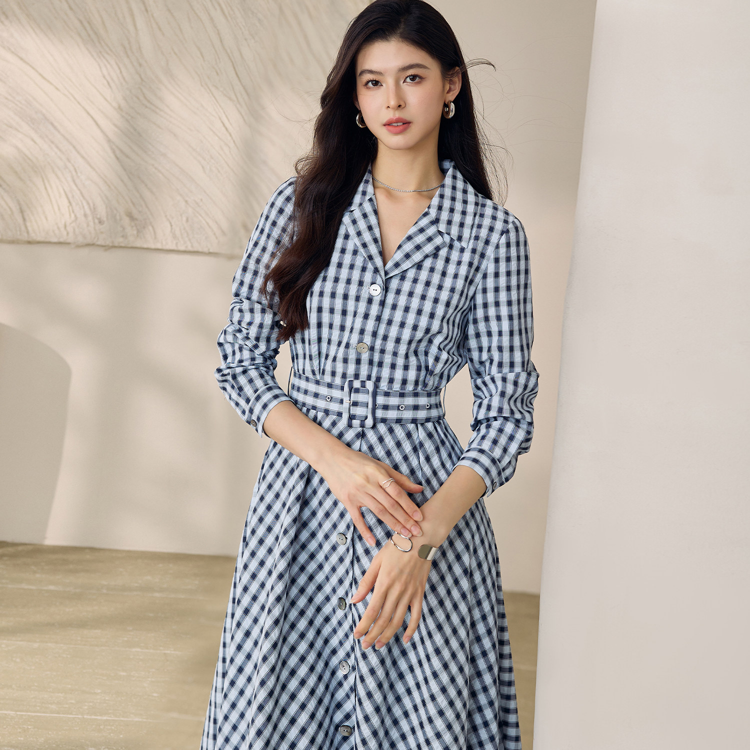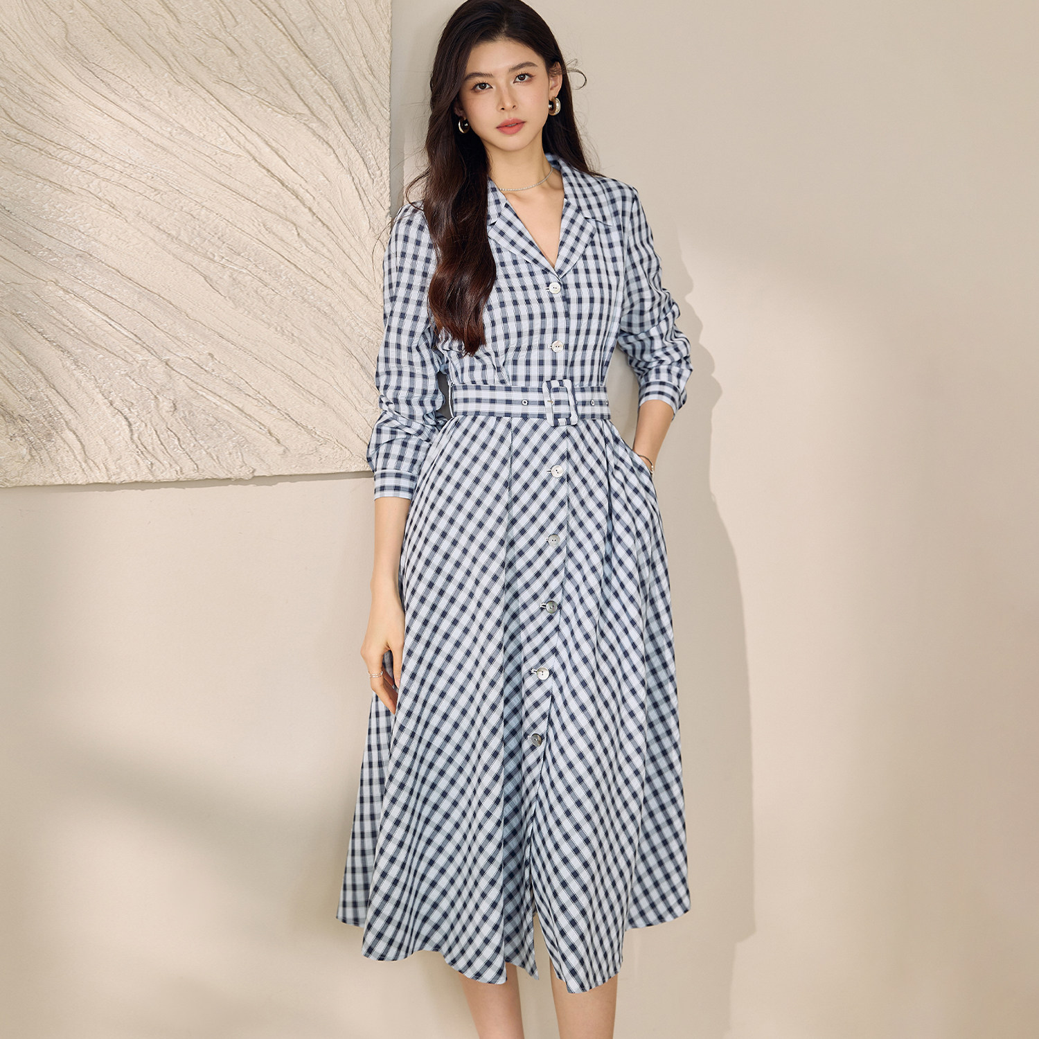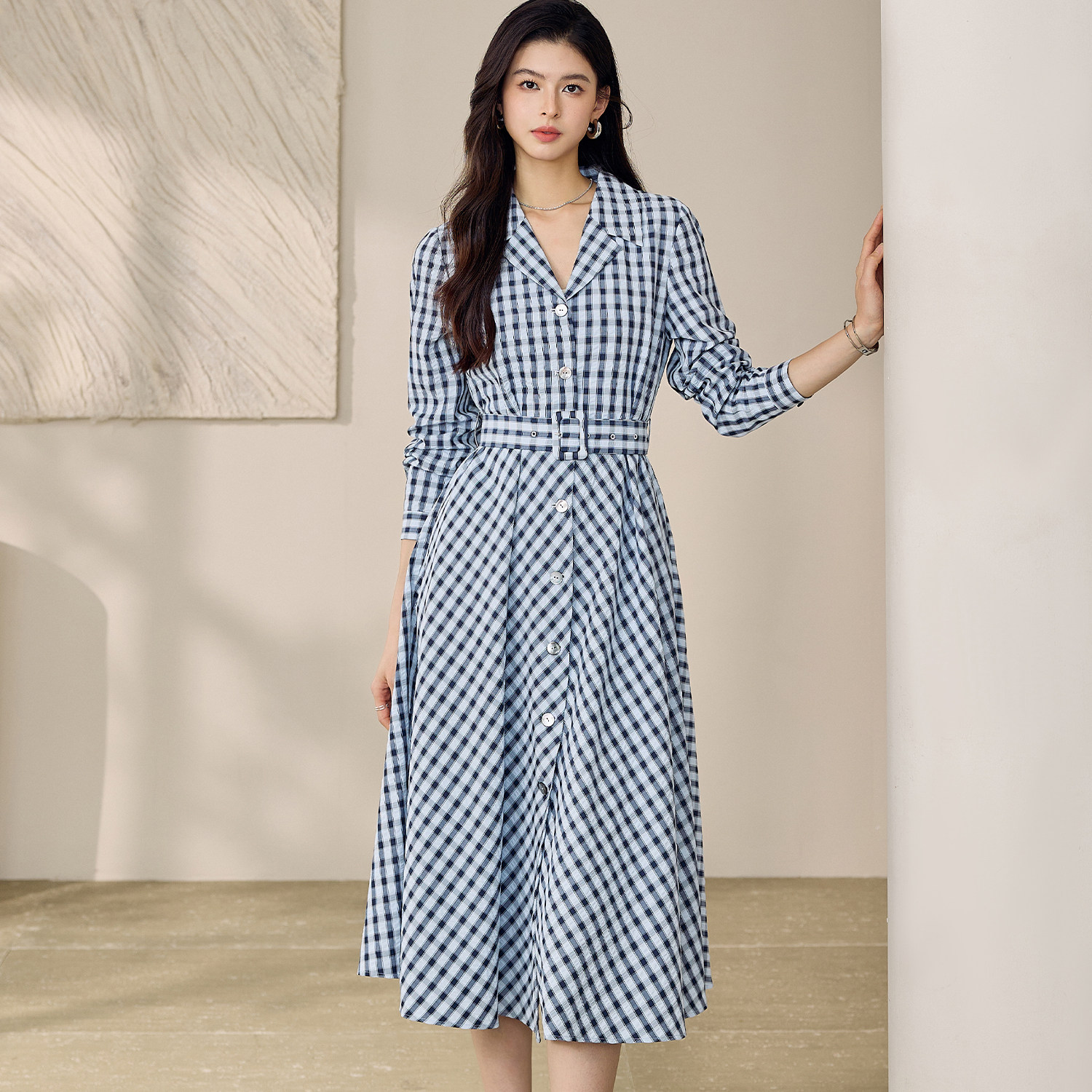 罗衣复古清新翻领衬衫连衣裙女春日常通勤白领格子中长裙子12529