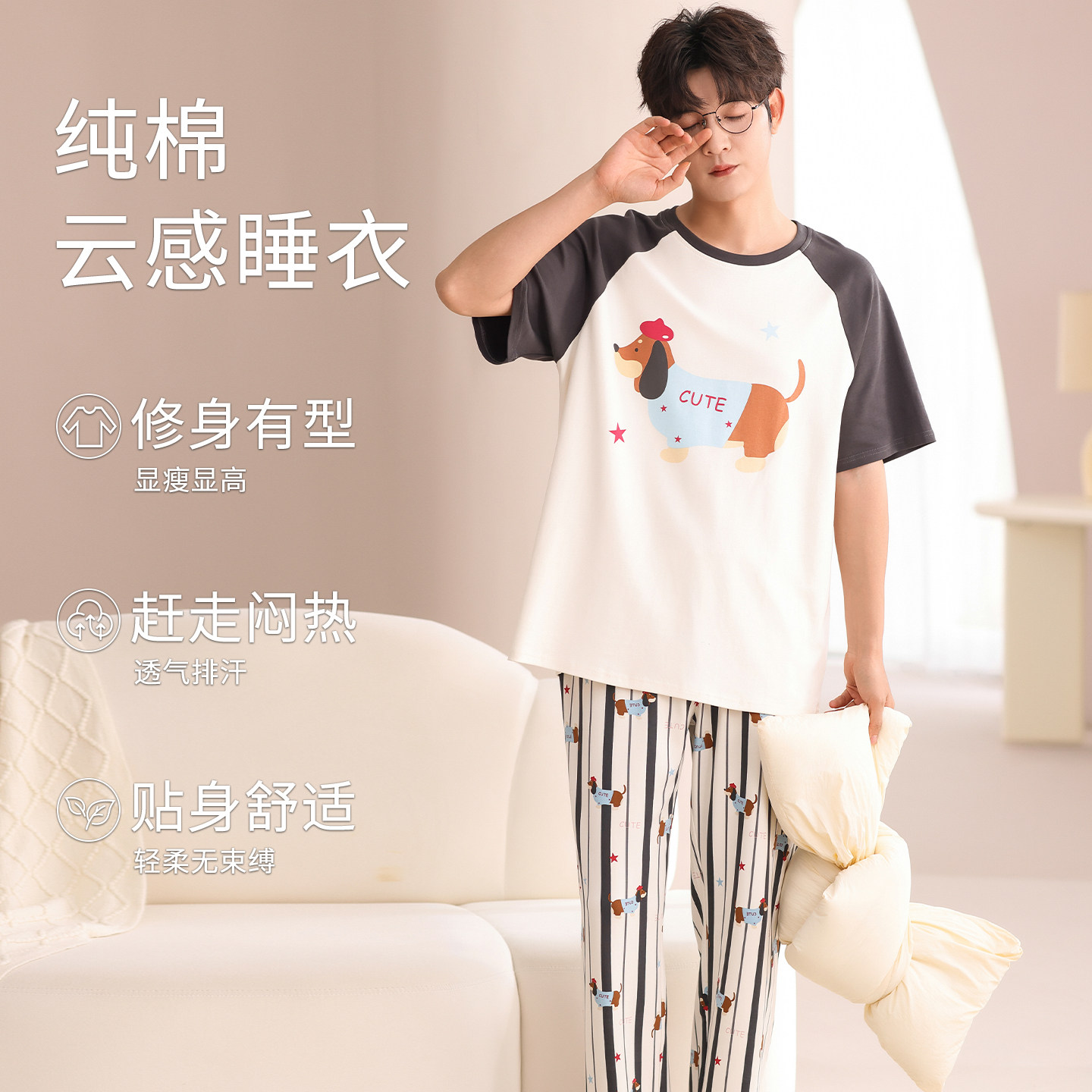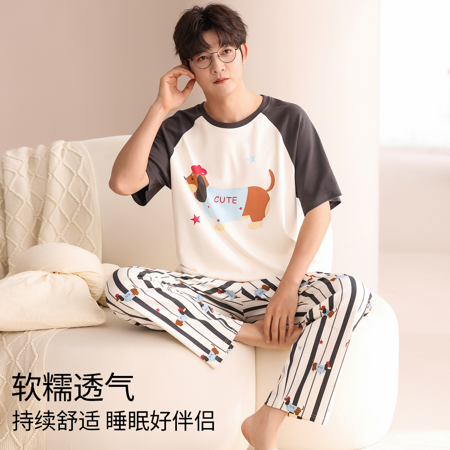 浪莎睡衣男款夏季纯棉短袖长裤2026新款大码全棉青少年卡通家居服