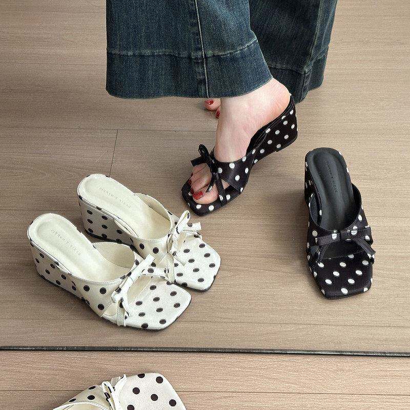 香港真皮厚底坡跟拖鞋女夏外穿2026新款高级感蝴蝶结波点高跟凉鞋