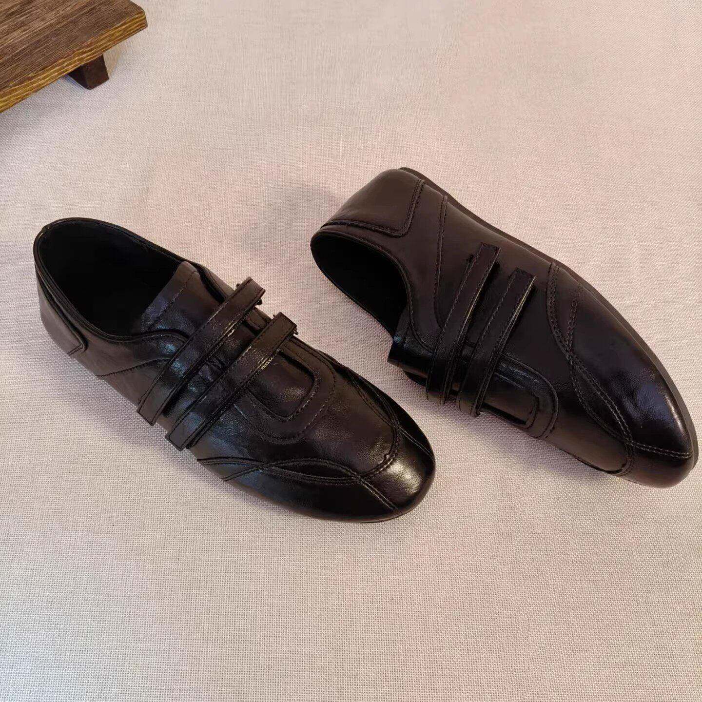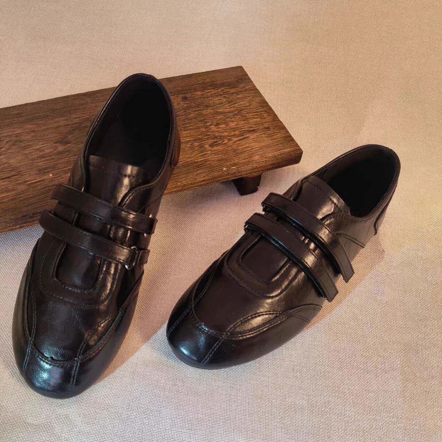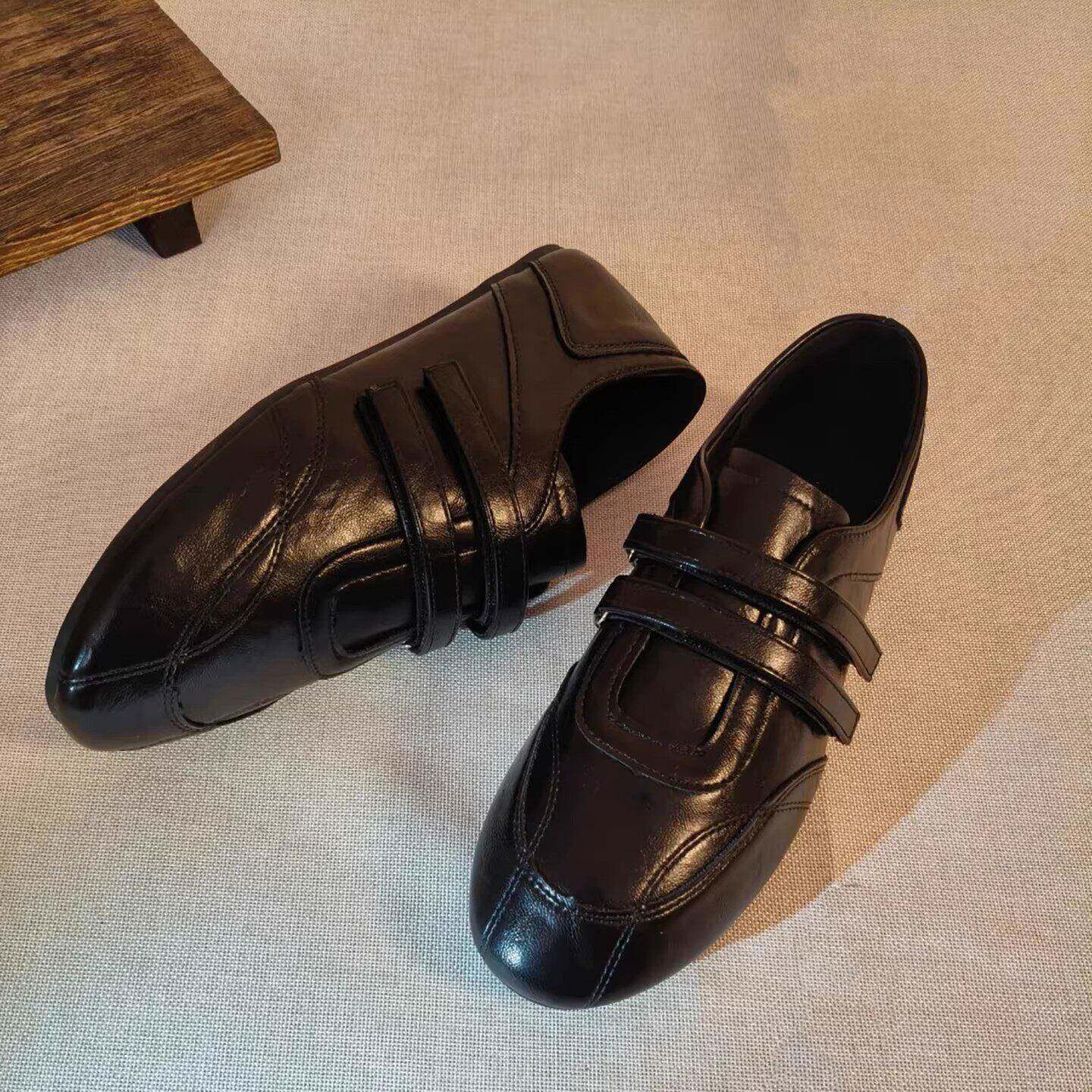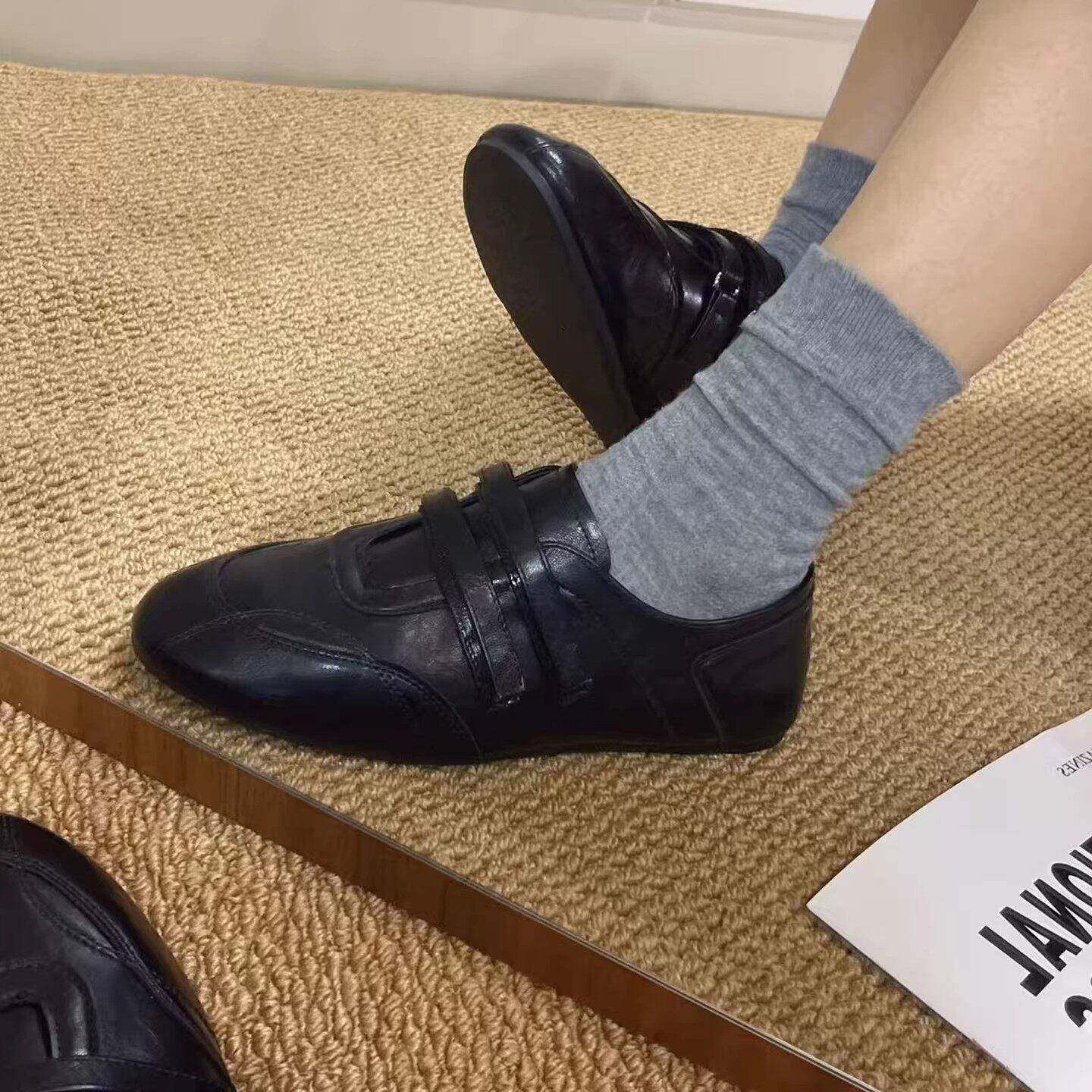 复古圆头黑色德训鞋子女2026春款魔术贴小皮鞋浅口平底休闲运动鞋