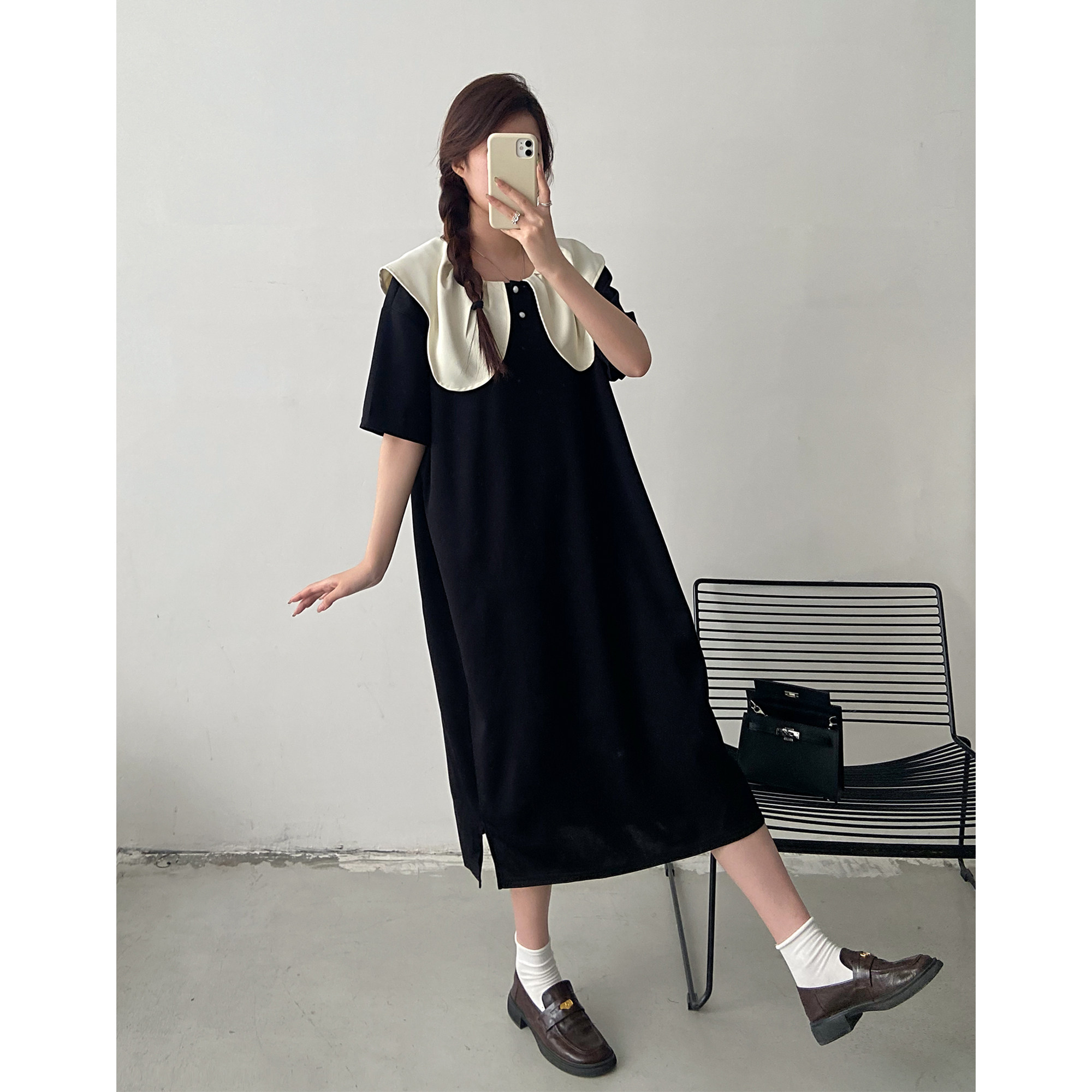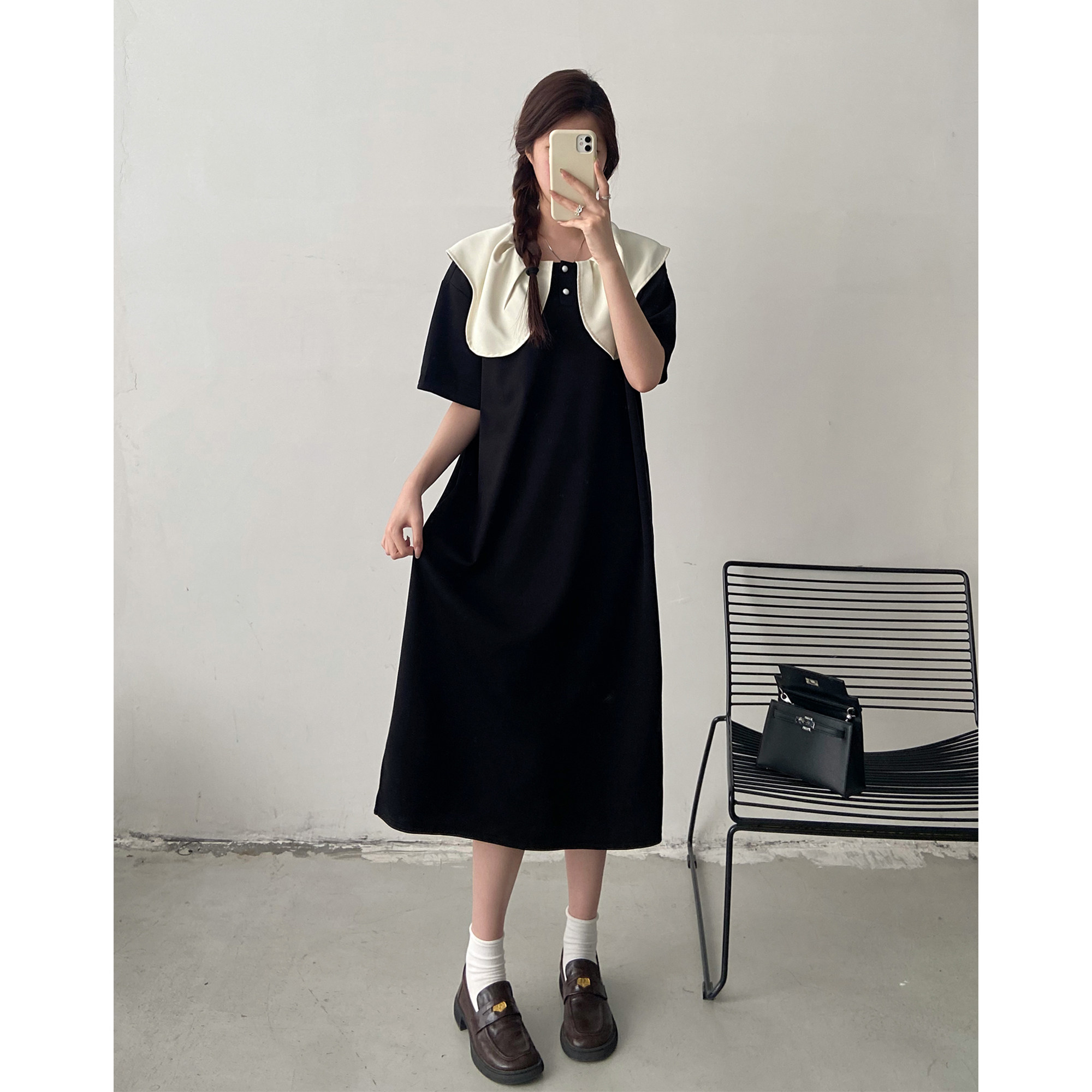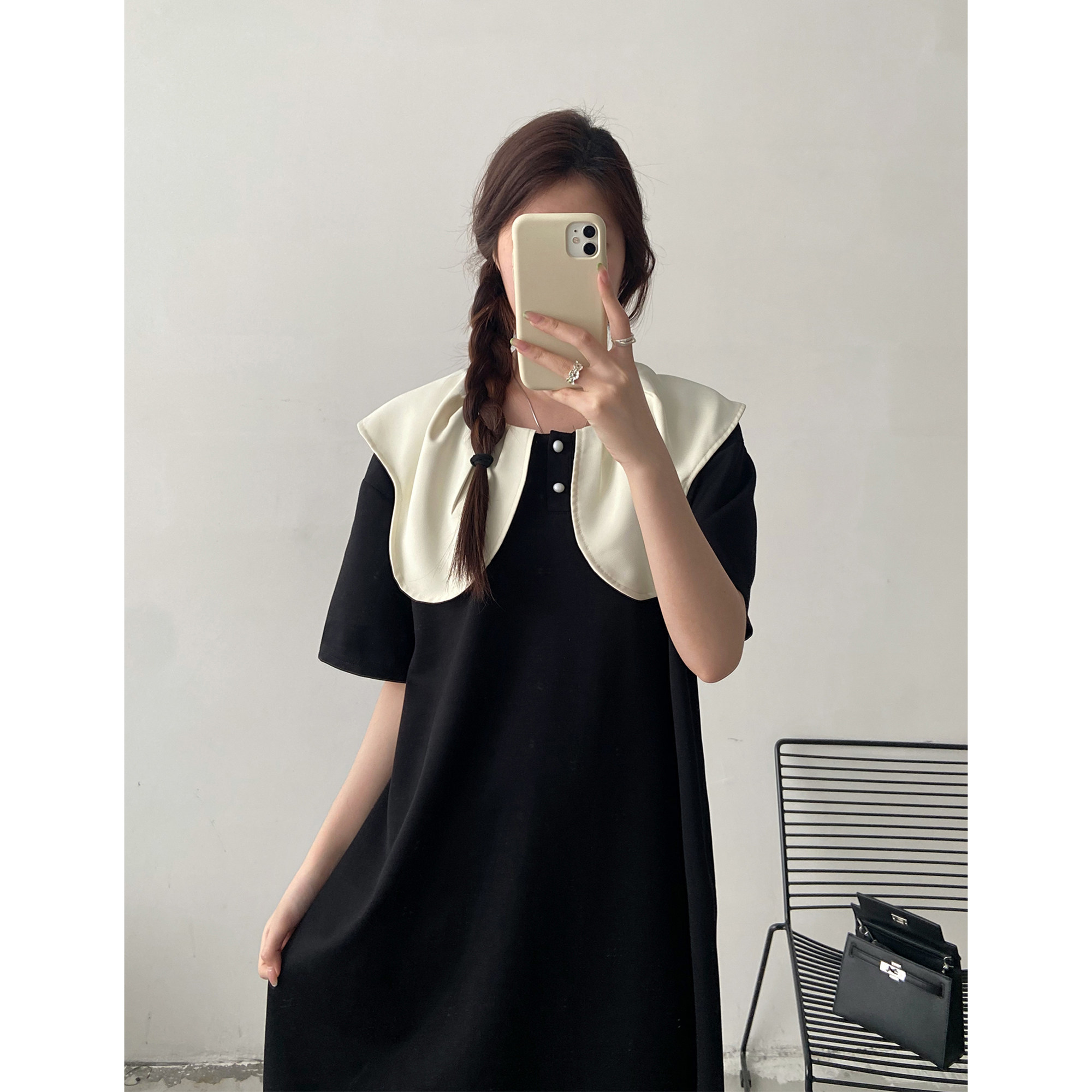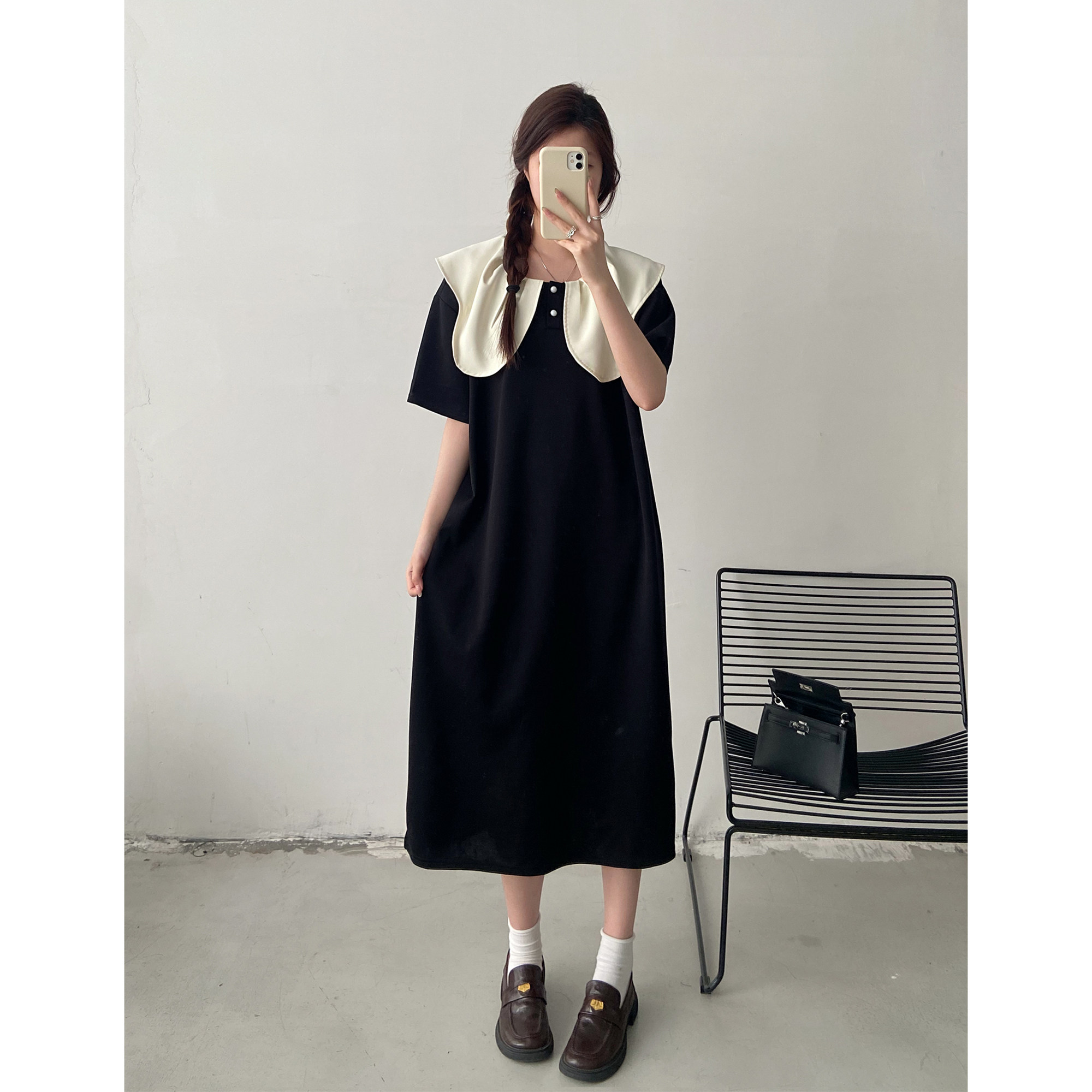 大码设计感小众娃娃领短袖连衣裙女2026夏季胖mm宽松显瘦法式长裙