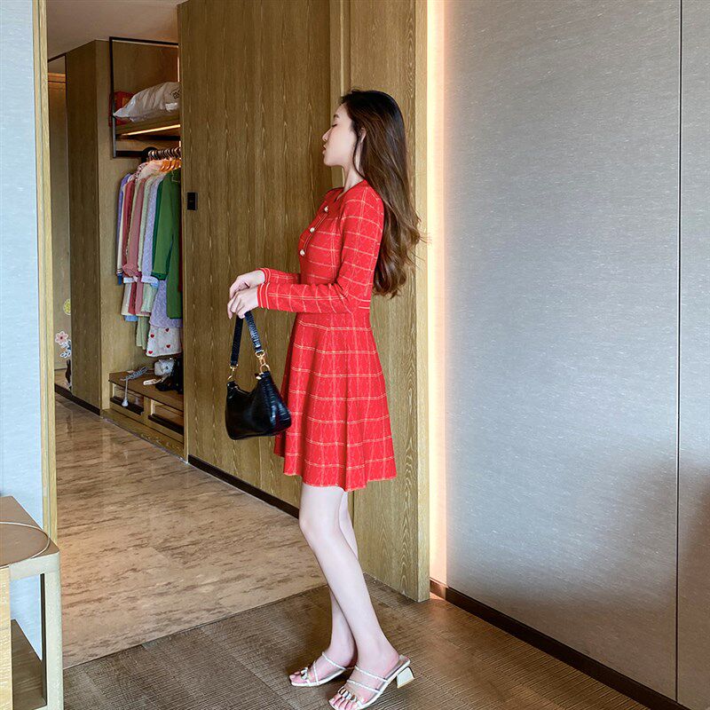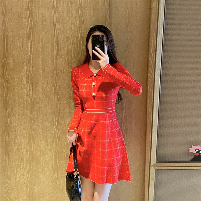 法式复古红色连衣裙女秋冬小个子POLO领a字修身显瘦短款针织裙子