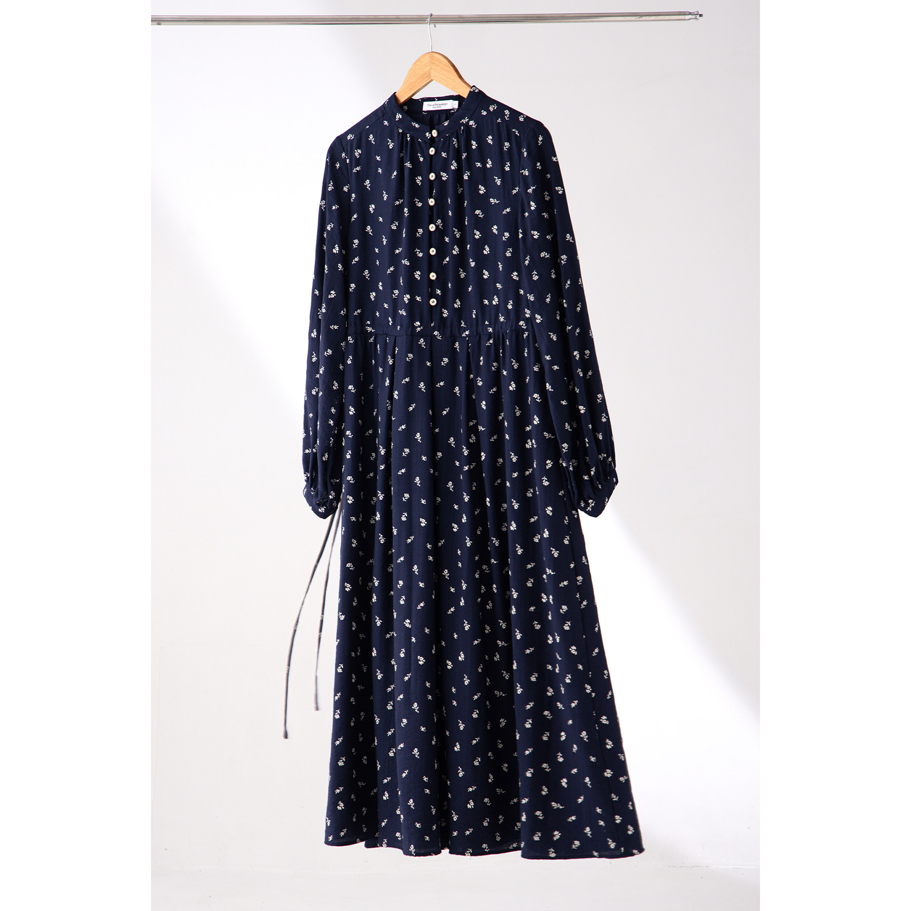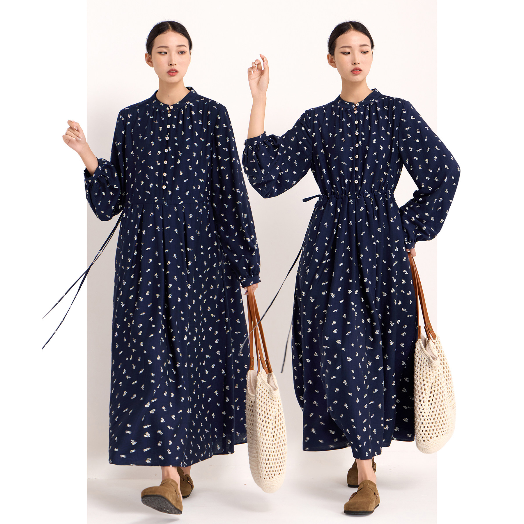 连衣裙女法式复古碎花长裙立领印花宽松收腰抽绳春秋季长袖连身裙