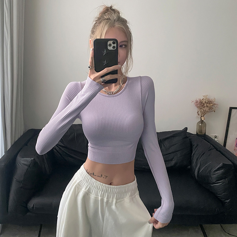 健身女孩带胸垫运动瑜伽服长袖外穿普拉提短款紧身显瘦跑步上衣秋