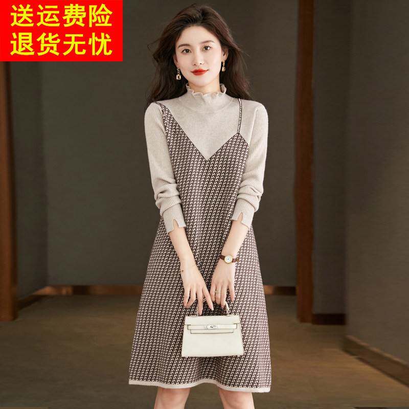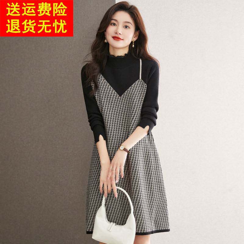 针织连衣裙女秋冬2026新款高级感内搭中长款毛衣假两件套装打底衫
