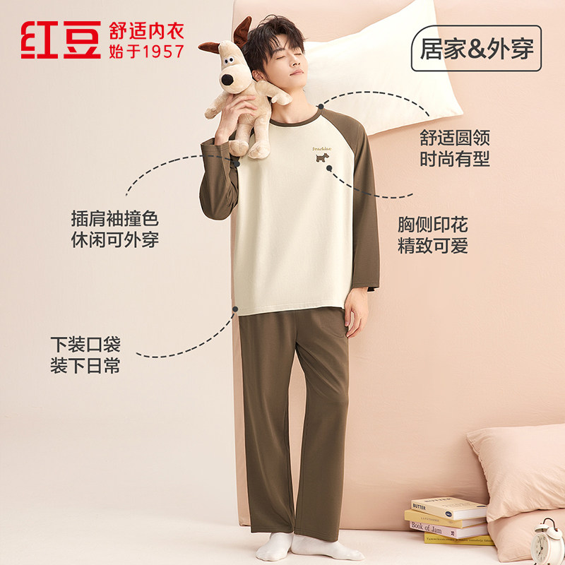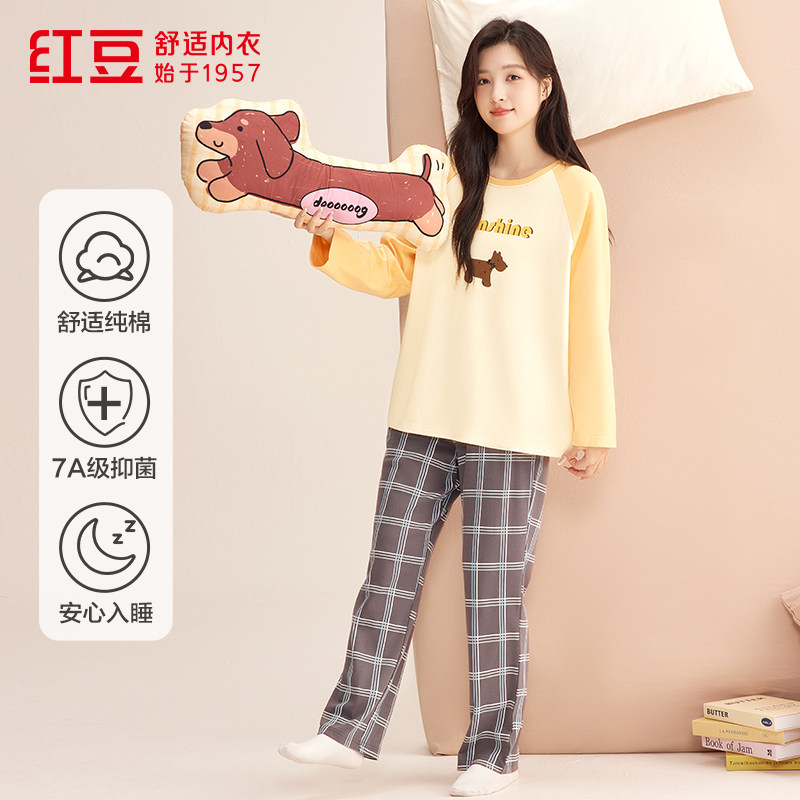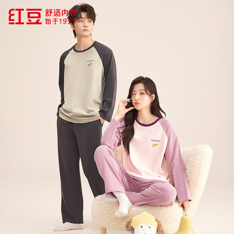 正品红豆春夏季100%纯棉男士女款全棉抑菌长袖睡衣套头家居服套装
