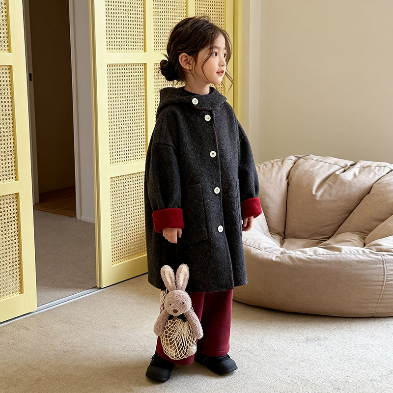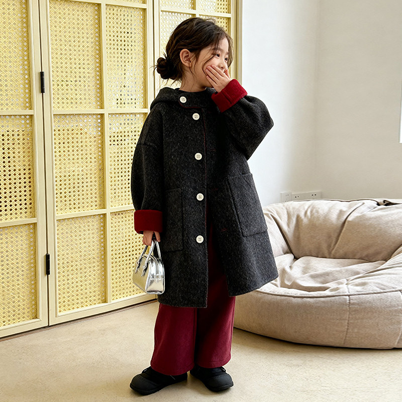 女款冬季连帽长款双面呢大衣外套2025年新款中大儿童加绒保暖衣服